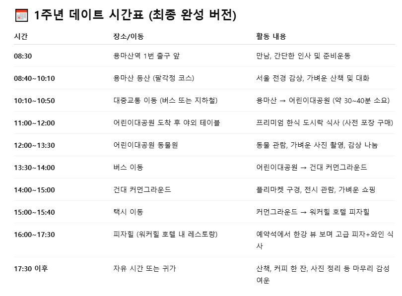 혼자 괜히 설레하면서 GPT에게 내가 그곳에서 데이트를 하는 그림을 그려달라고 말한다... 아이고... 같이 데이트를 할 사람만 있으면 아주.... 아주... 에고... 뭘 그래... 어느새 저 시간표의 데이트는 W의 것이 아니라, 내 것이 되어버린다. 나의 그녀와 8시 반에 용마산역에서 만나고 간단한 준비운동을 하는 거야. 용마산 꼭대기에 올라서, 나 저기에 갇혀서 정말 답답했어! 말하고... 그리고 어린이 대공원에 가서 동물들을 둘러보며, 사진 찍어주고 ㅠㅠ 같이 건대 커먼그라운드 플리마켓에서 나의 그녀가 관심 있어하는 게 무엇인지를 보는 거야! 재미난 구경거리를 보며.... 그러다가 '널 위해 준비했어!' 하면서 워커힐 호텔 내부의 레스토랑으로 택시 타고 가는 거야. 그러면 나의 그녀는 "뭘 이렇게 무리했데..." 툴툴 대면서도 기분 좋아하겠지... 한강이 보면서 피자와 와인을 마시고... 하아... 기분 좋아!