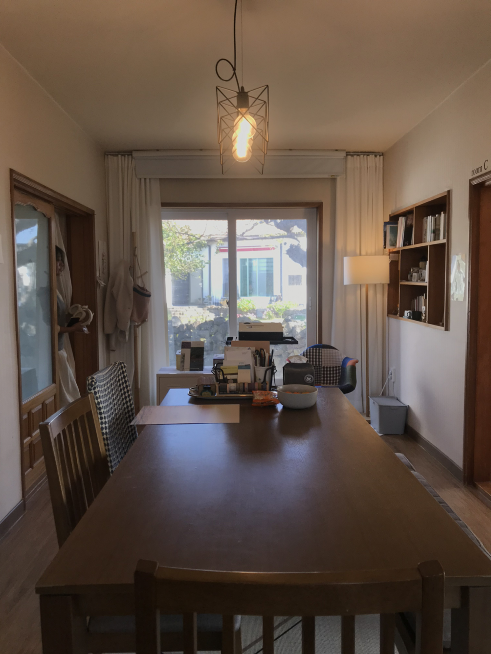 한경면 판포리라는 조용한 마을에 있는 게스트 하우스. 시골집 분위기 물씬 느껴지는 집 외관을 들어서니 따스한 온기가 느껴졌다. 오후 4시, 여행객들이 들어오기엔 이른 시간이다 보니 처음 온 공간에 나 혼자였다. 천천히 내가 지낼 방을 둘러봤다. 오, 아늑하다. 책장에 꽂힌 책들을 살펴보니 주인장의 책 취향이 왠지 나와 비슷할 것 같다는 생각이 들었다. 내가 좋아하는 책들이 많았다. 책장 옆에는 그림을 그리기 좋을 책상과 여유로운 옷걸이 까지. 사실 제일 만족스러웠던 건 전기장판! 추위를 많이 타는 나 같은 손님을 위한 사장님의 배려가 느껴졌다.