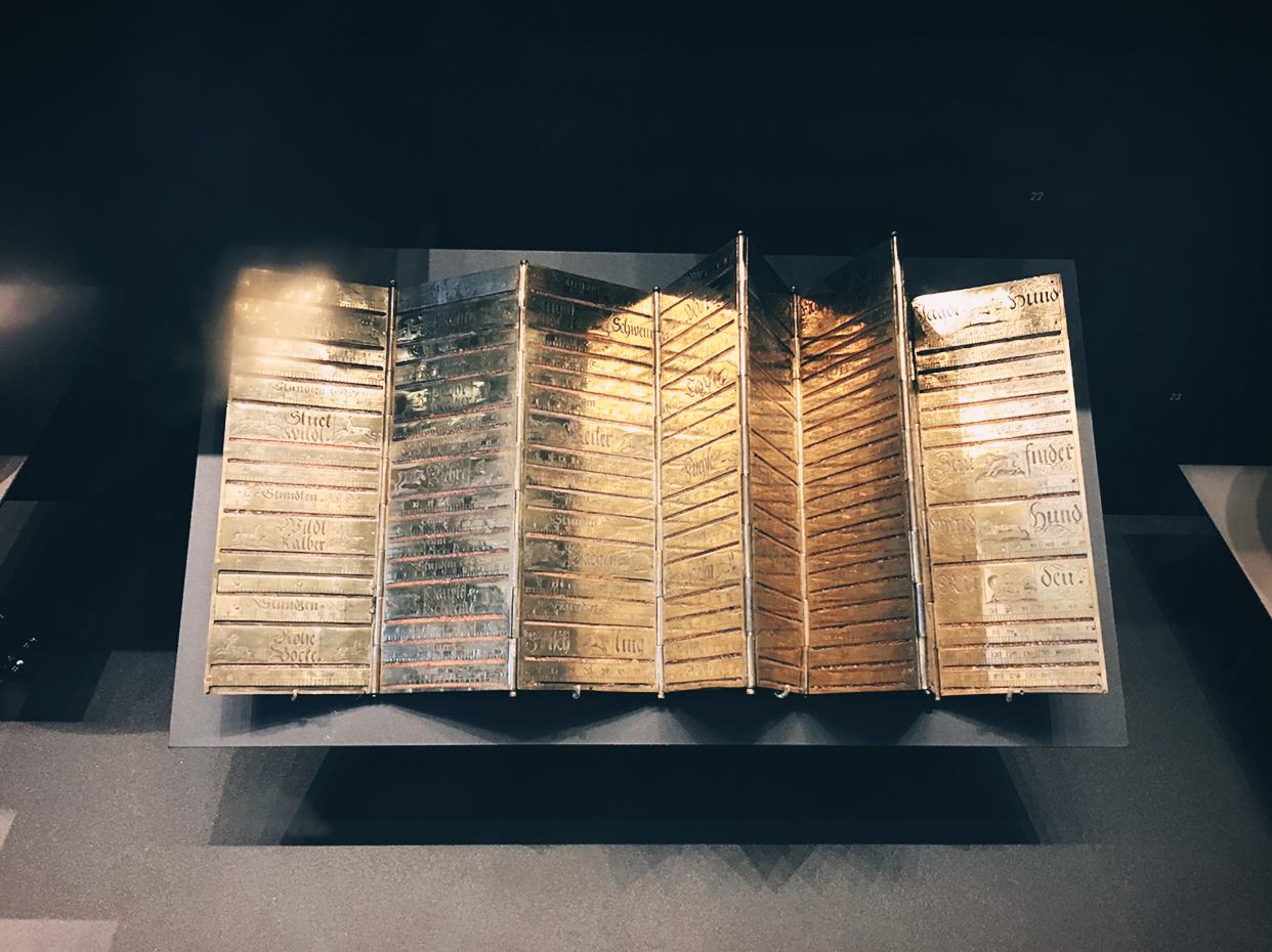 옆을 보니 화려하게 장식된 책자 같은 게 보인다. 무언인가 하고 자세히 보았더니 사냥 목록을 적어 놓은 것이었다. 이 화려한 금색 판자 위에 빼곡하게 적힌 사냥 목록을 보니 어느 시대에나 먹고사는 문제가 중요한 1순위였음을 미뤄 짐작해 볼 수 있다.