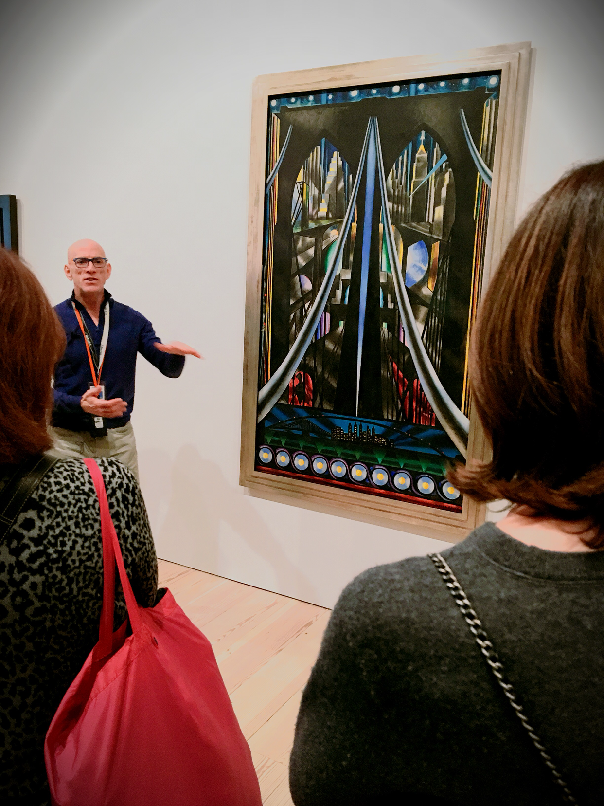 미술관 한 편에 그룹 지어 사람들이 열심히 도슨트의 설명을 듣고 있는 모습이 보인다. 나도 슬쩍 그 틈에 껴 설명을 듣기 시작했다. 이 그림이 유명해진 이유를 알려준다. 바로 그림의 상/하단과 중앙부에 나타나는 대조 때문이란다. 그림의 기법이 중간에는 르네상스 시대의 이탈리안 화법이고 상/하단은 미래주의[Futurism]로 대비를 이룬다. 물론 그림 화법 자체의 특이함도 있지만 다른 상반성도 눈에 띈다. 상단과 하단에는 번쩍번쩍 뉴욕 도시의 화려함이 보인다. 그러나 이 그림을 자세히 보다 보면 그림의 중앙에는 왠지 모르게 도시의 어둠과 쓸함이 묻어 있다.