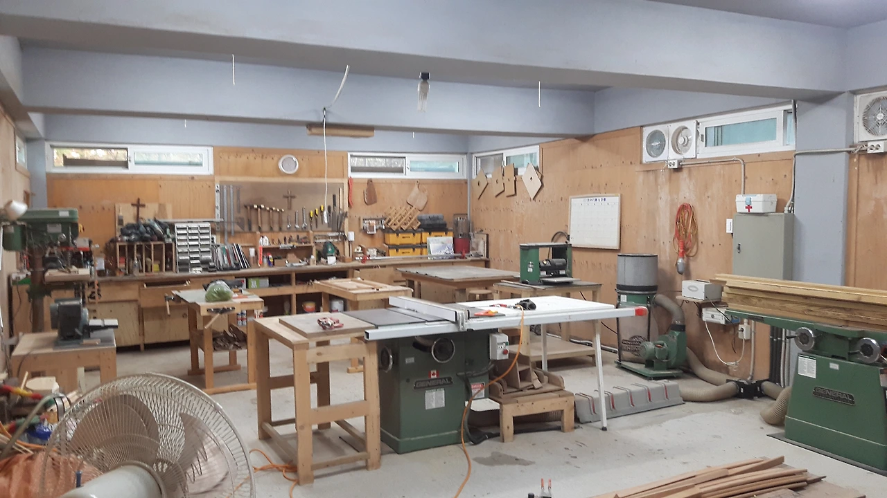 애초에 15평 크기의 창고였는데 목공실로 개조한 것이다. 원래 창고였기 때문에 바닥이 거칠어 먼지가 많이 나고 합판으로 마감한 벽은 여름 장마철 누수로 인하여 곰팡이가 여러 군데 끼어있다. 손을 불까 하고 생각은 했었지만 혼자서는 엄두가 나지 않아서 손을 대지 못하고 있었다. 이번에 이곳을 총괄 관리하는 장로님 주도로 모든 기계와 공구를 들어내고 대 청소를 하였다. 바닥은 에폭시를 발라 깔끔하게 마감처리하고 벽에는 페인트를 다시 칠했다. 어제 기계를 다시 들어 놓고 모든 공구와 자재를 재 배치하며 정리정돈을 하였다. 이 목공실을 시작할 때 내심 한 가지 목표를 정해