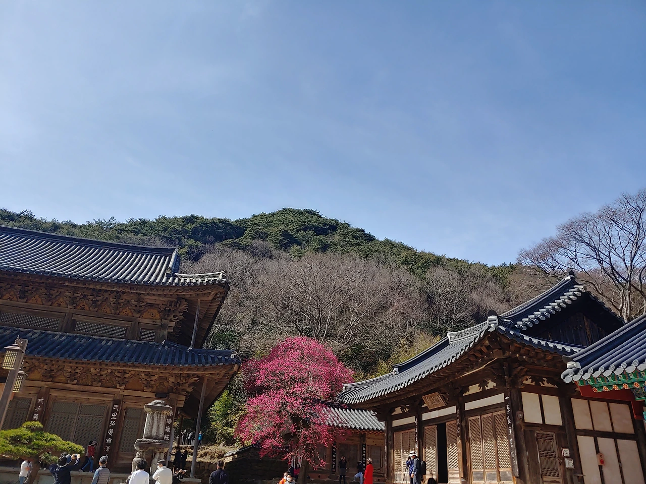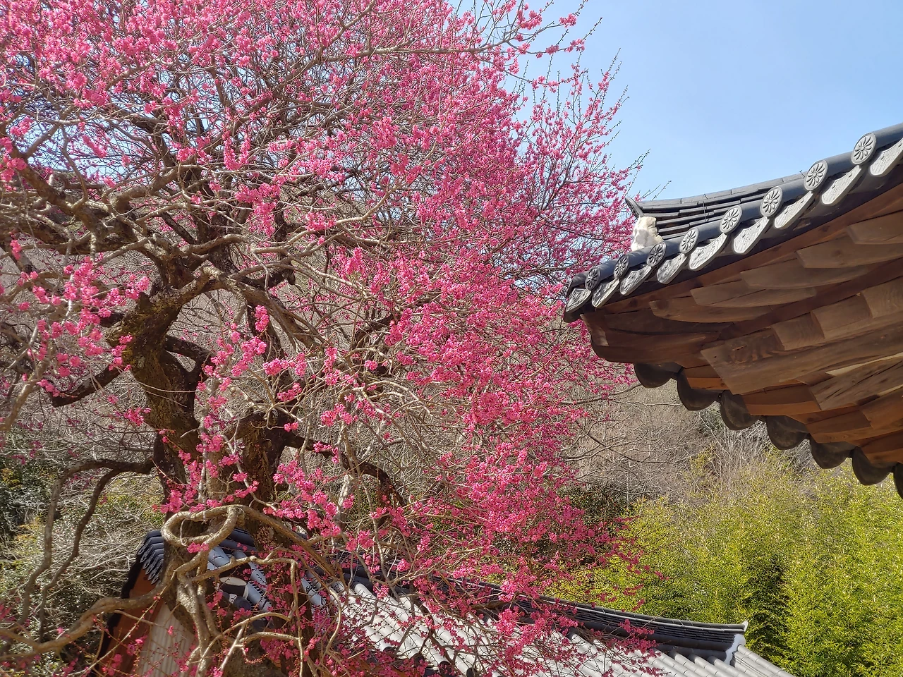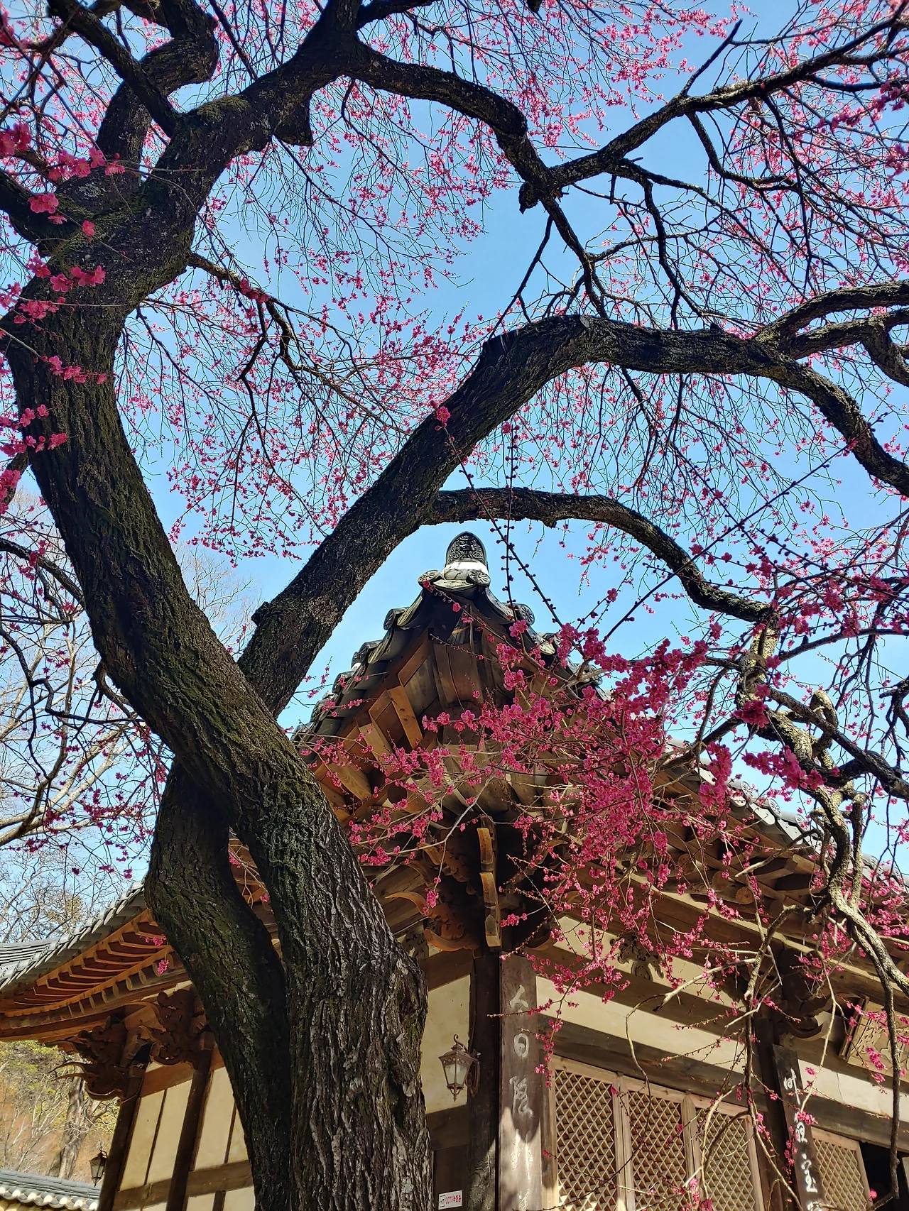 서해까지 밀러 왔다는 중국 발생 황사 소식은 귀에 들어오지도 않았다. 첫 목적지인 구레 화엄사를 향하여 아침 일찍부터 자동차 액셀을 힘차게 밟았다. 미세 먼지와 황사를 내심 걱정했는데 하늘이 예상보다는 맑고 푸르다. 차령산맥을 넘어 대전을 지나고 나니 대지의 봄기운이 완연히 느껴졌다. 드문 드문 눈에 들어오는 냇가의 수양버들이 벌써 연녹색 속치마를 바꾸어 입고 우리를 유혹하고 있었다. 기온이 거의 15•c를 넘어 겨울 방한복을 입고 왔더라면 낭패를 당할 뻔했다. 화엄사 주차장에 들어서니 상춘객이 분비지 않고 아직은 한산했다. 일주문을 넘어 가람 속으로 들어가니 멀리 대웅전 지붕이 올려다 보이고 그 끝자락에 홍매가 머리를 살짝 내밀고 우리를 기다리고 있었다. 매화는 내공이 깊어 그 해의 개화 시기는 지나간 겨울 날씨에 의해 결정이 된다고 한다. 그래서 해마다 개화 시기가 다르기 때문에 먼 곳에 있는 귀매는 상견할 수 있는 적기를 맞추기가 매우 힘들다고 하였다. 멀리서 보아도 우리는 때 맞춰 찾아온 것 같았다. 백양사 홍매, 별칭 흑매는 남도 5매 중 하나다. 수령이 사백 년이 넘어서인지 가까이 다가가서 보니 오랜 연륜의 품위와 위엄이 느껴졌다. 시진으로 홍매를 보고서는 때깔이 너무 화려해서 마치 선술집 작부처럼 보인다고 혹평을 한 적이 있는데 오늘부터 그 마음을 고쳐 먹기로 했다. 역시 백문이 불여일견이다. 전체 색깔은 분명히 붉게 보이는데 가까이서 보니 꽃잎 속에 은근한 흑색이 깊게 들어있다. 그래서 흑매라고 부르나 보다. 흑매의 은은한 암향이 소리 없이 아침 산사를 뒤덮고 있다.