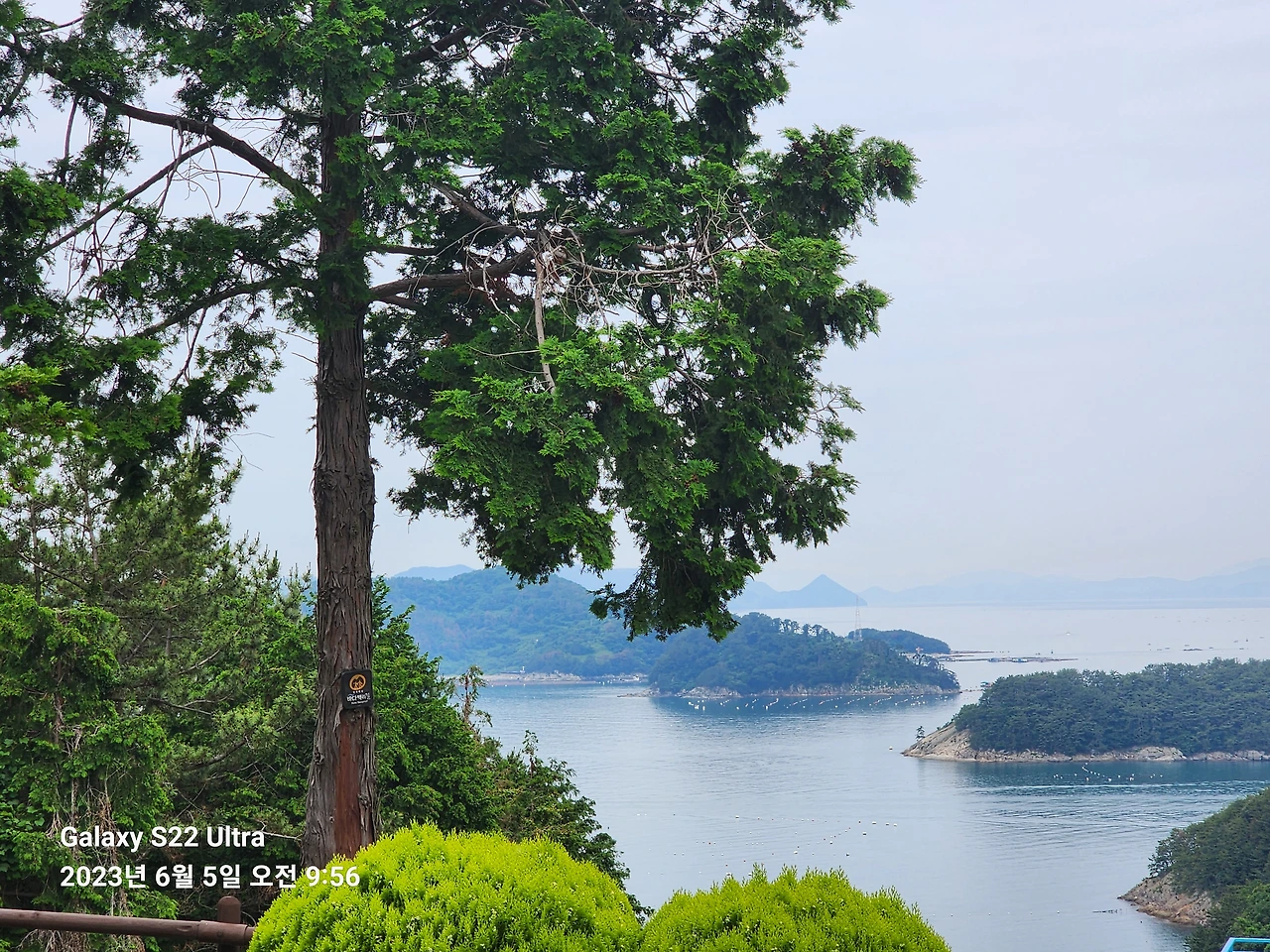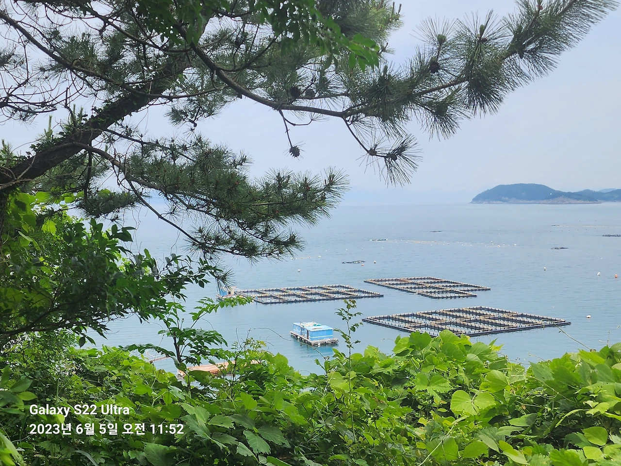 조금 오르다 뒤 돌아보니 방금 하선한발치의 선착장과 마을이 너무 이쁘게 내려다 보였고 연안의 가두리 양식장들도 마치 바둑판처럼 색다른 모습으로 우리 눈을 즐겁게 해 주었다. 동쪽으로는 미륵도 앞바다의 크고 작은 유 무인도가 초여름의 따스한 햇살을 받으며 졸고 있었고, 서남쪽으로는 저 멀리 연화도, 욕지도가 가물가물 눈에 들어왔다. 날씨가 좋아서 북으로는 사량도가 보였고 그 뒤 하늘 끝자락에는 지리산 천왕봉도 보였다.