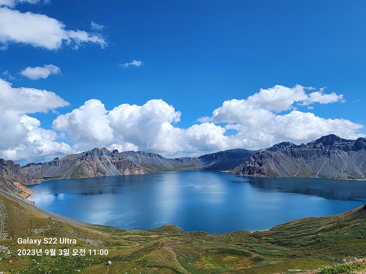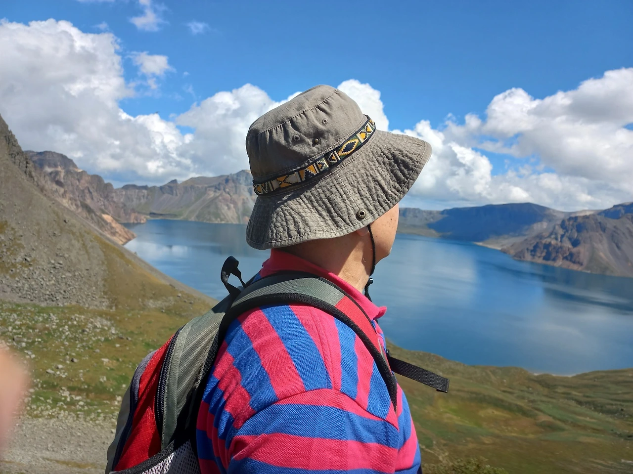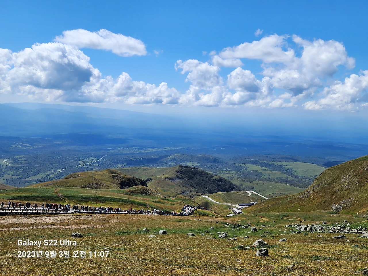 오늘은 그 한을 모두 풀어주기라도 하 듯 날씨가 너무 맑고 하늘은 푸르다. 천지보다는 돌아서서 보이는 만주벌이 자꾸 눈에 밟힌다. 발아래 저 대지는 지난날 우리 선조들이 말을 따고 달렸던 우리 땅이었다.