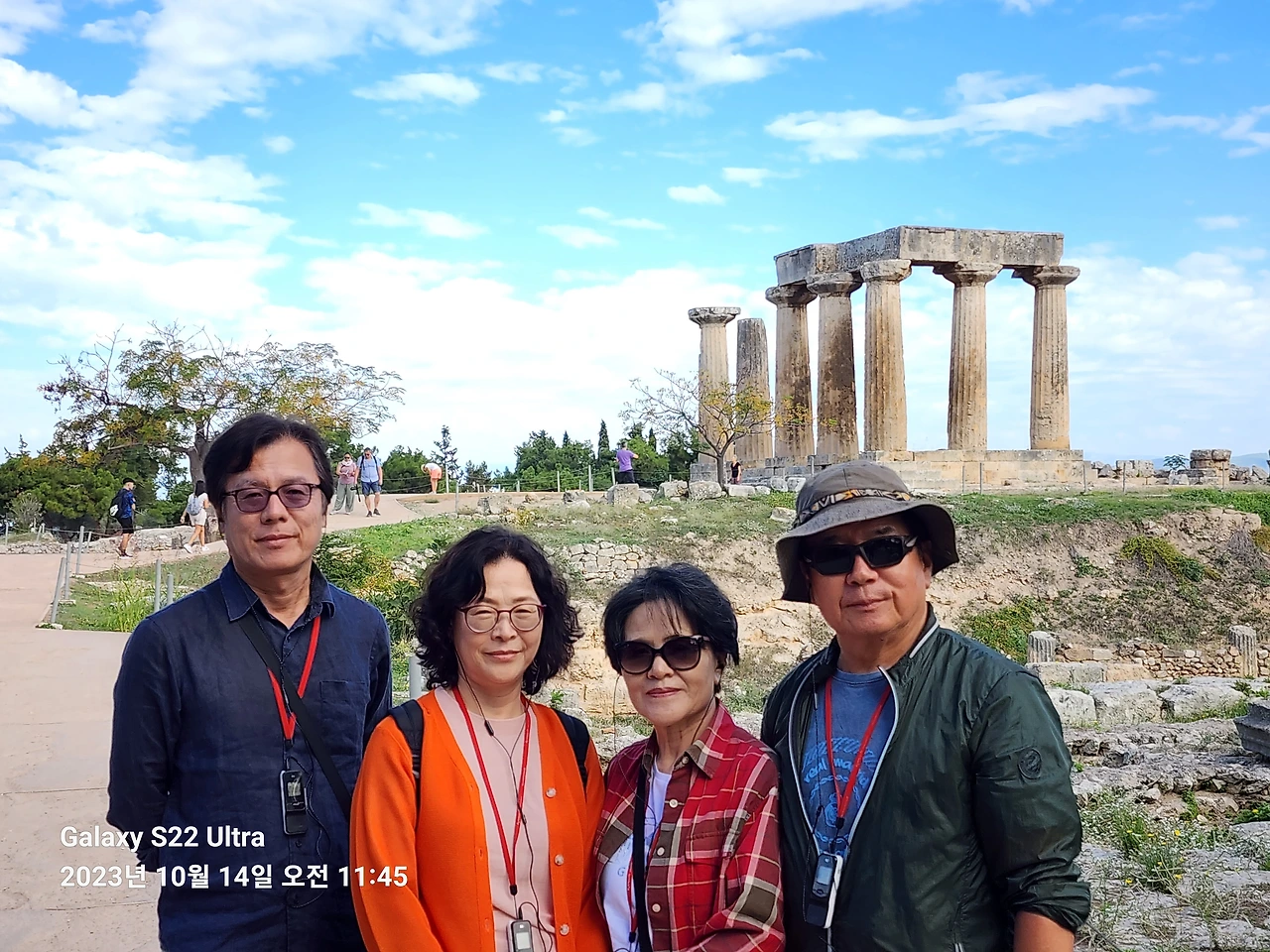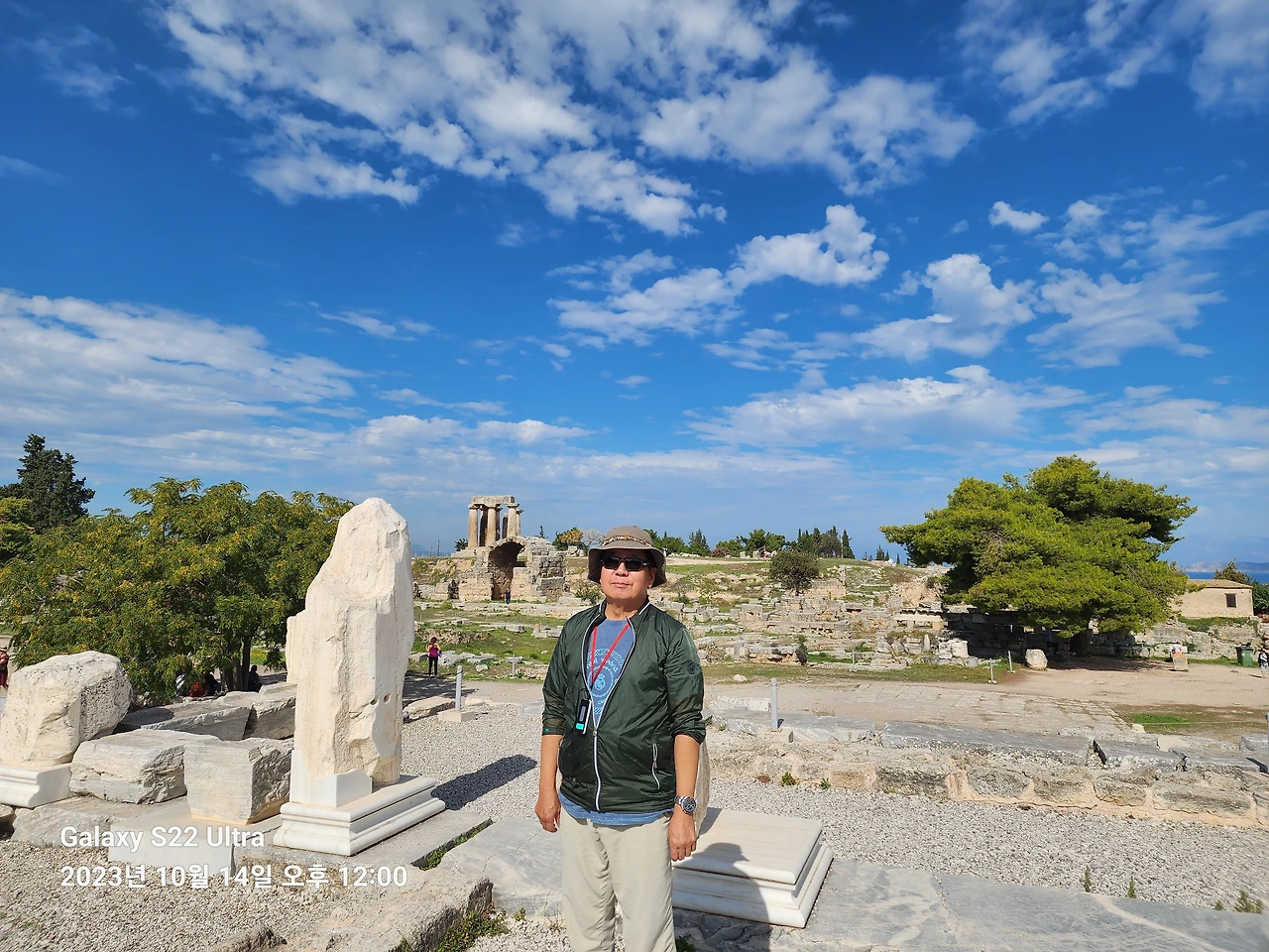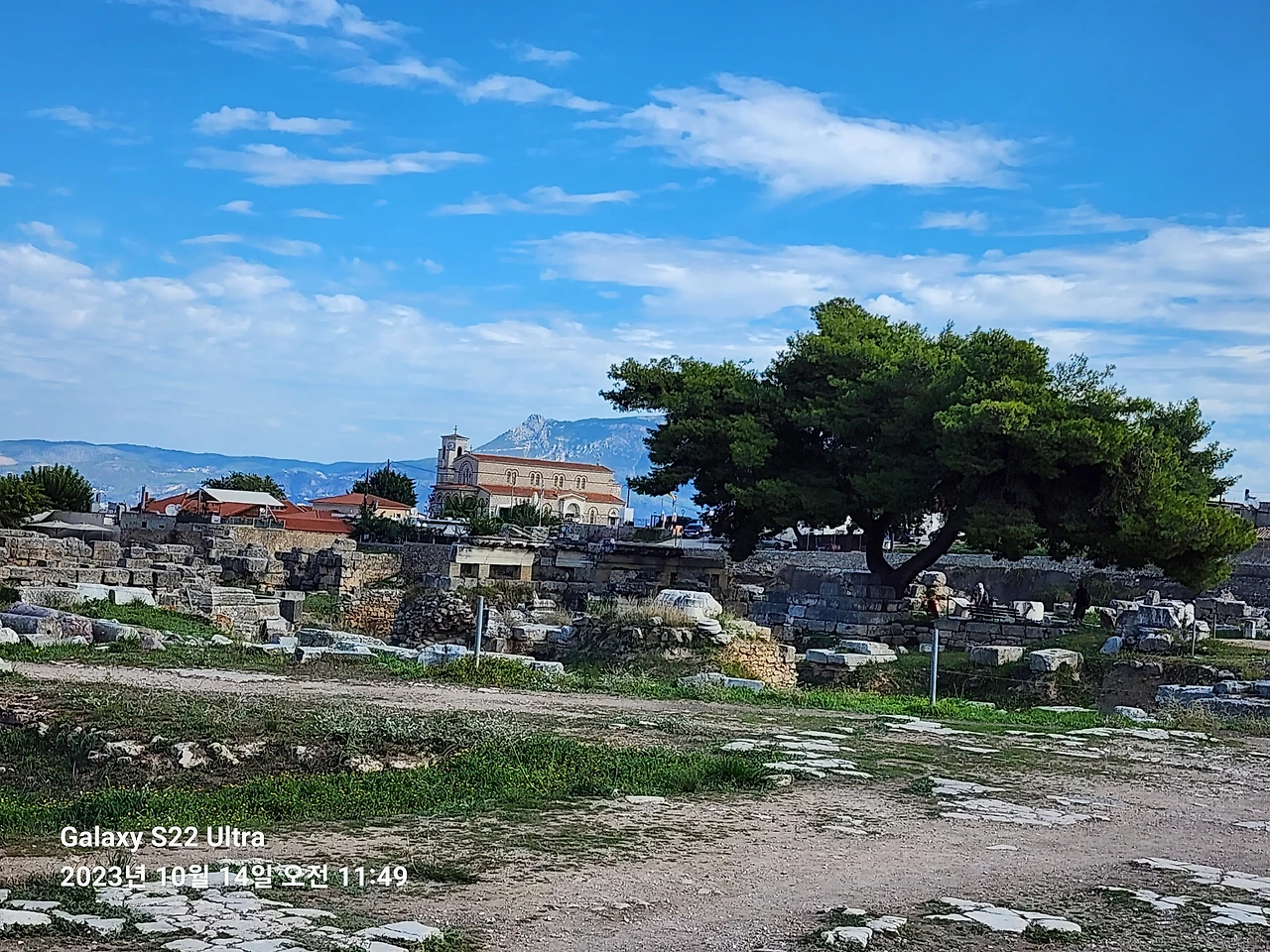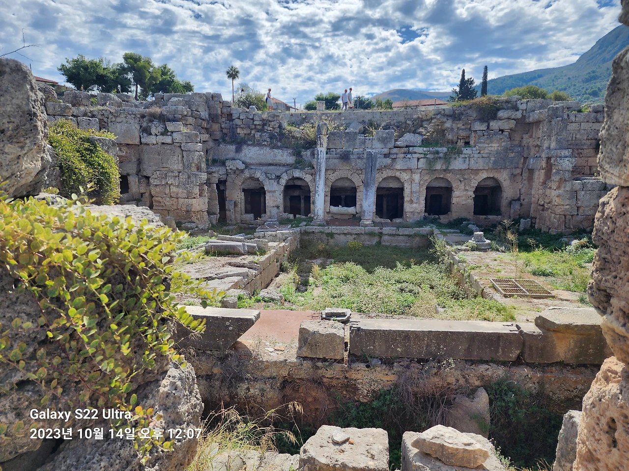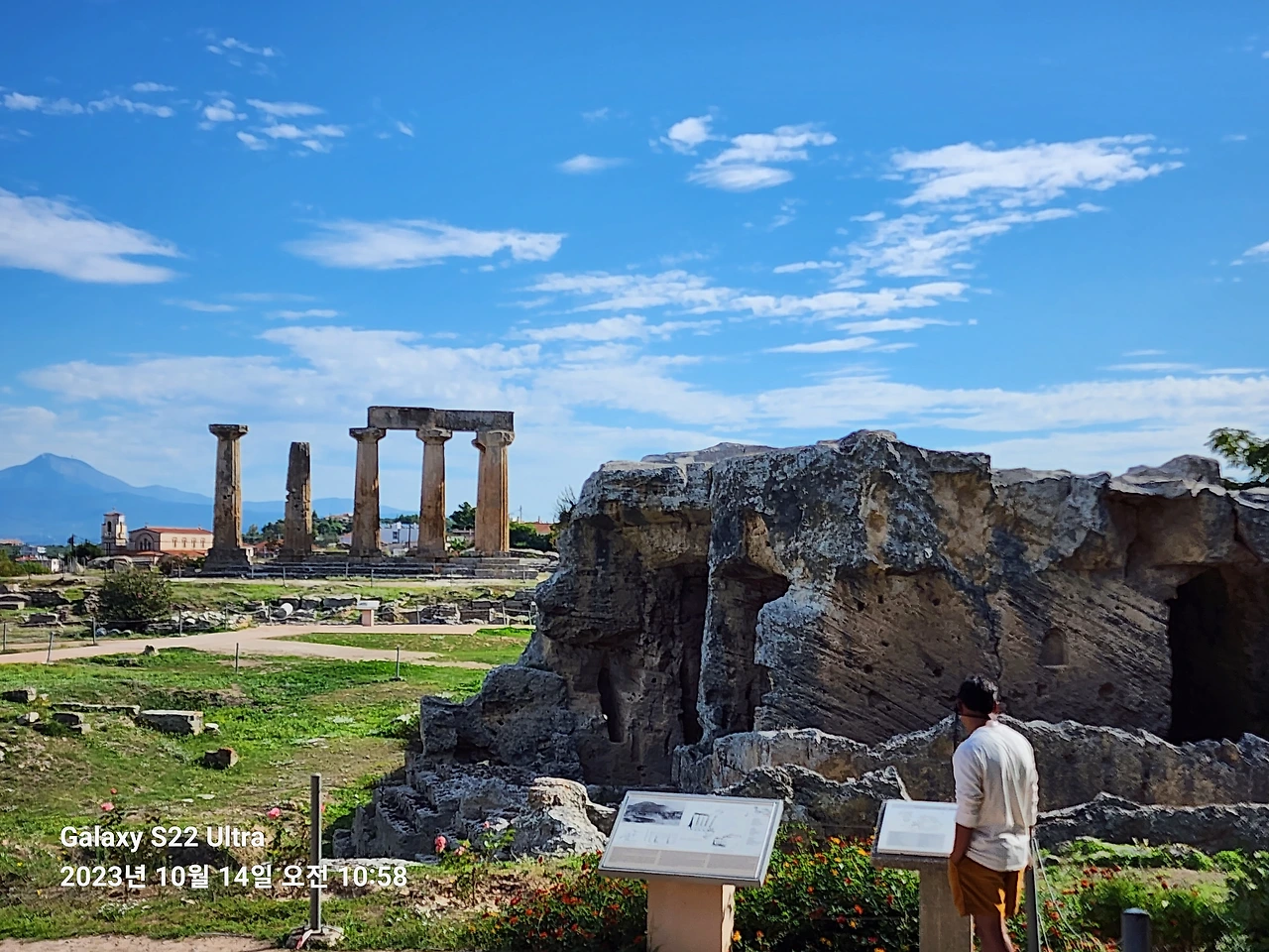 고린도에 있는 사도바울을 기념하는 정교회에 들렀다가 고린도 유적지로 갔다. 비록 열주 (당시에는 기둥을 이어 붙이는 기술이 없어서 하나의 통돌로 기둥을 깎았다.) 몇 개만 남아 있지만 아폴론 신전이 자태를 뽐내며 맞이해 준다. 그 옆으로 그리스 3대 비극 중 하나인 메데이아의 이야기를 품고 있는 바위를 지나 박물관에 입장하니 제일 먼저 우뚝 서있는 조각상 두 점이 내 눈에 들어온다. '아르카익 스마일(고졸의 미소)'라 불리는 기원전 6세기 경 그리스 초기 조각이다. 이것만 사진을 찍지 못하게 해서 뒷모습만 겨우 한 장 찍었다. (내일 아크로폴리스 박물관에서 마저 더 봐야지). 소크라테스가 크리톤에게 유언하기를, 내가 아스클레피오스에게 닭 한 마리 빚졌으니 갚아달라고 유언했다는 바로 그 의학의 신 아스클레피오스의 방, 고린도 사람들의 투구, 선사시대의 다기 등 수많은 유물들을 보고 나오니 시대가 바뀌어 바로 로마시대 포룸이 나타났다.