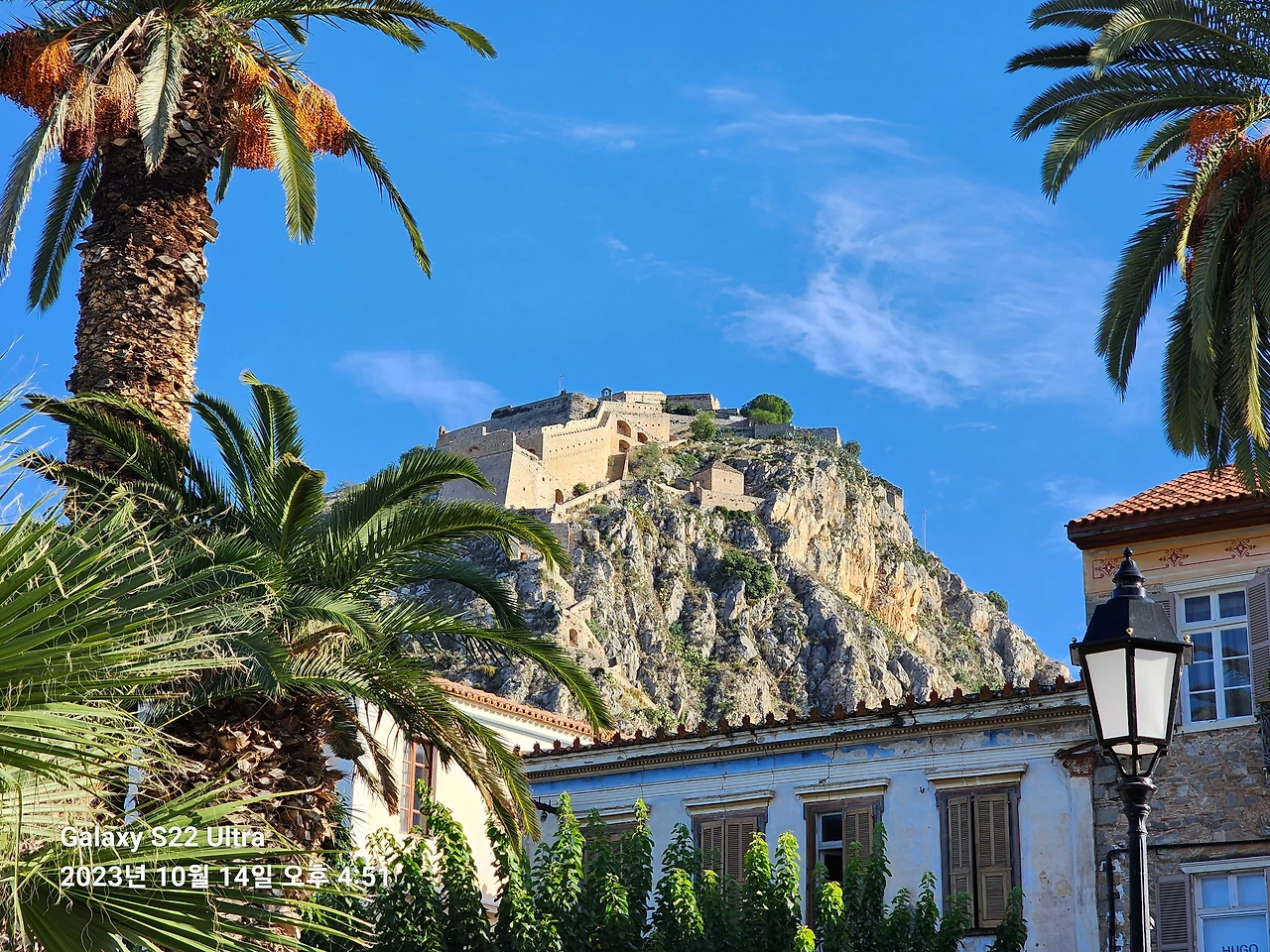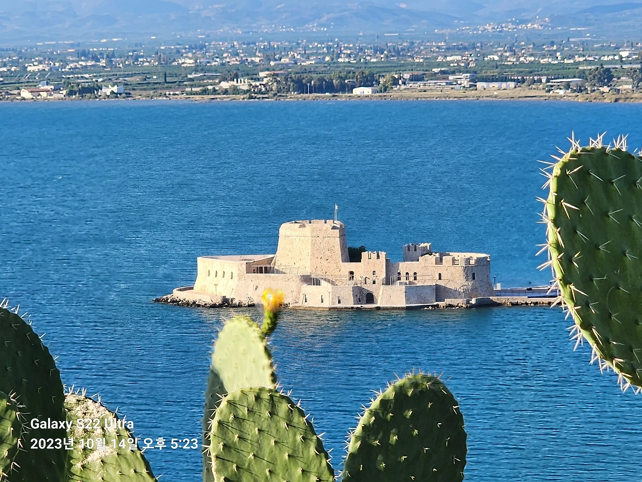 바다가 잘 내려다보이는 전망 좋은 카페에서 커피 한 잔을 하고 다음으로 간 곳은 해변 휴양지 나플리오. 베네치아령이었던 이곳에선 약간 서유럽 분위기가 난다. 한국 드라마 촬영지였다는 곳에 가서 내려다보니 그리스는 과연 바다와 섬이라는 걸 확실히 느끼게 해 준다. 밝은 햇살 아래 푸른 하늘과 파란 지중해 바다