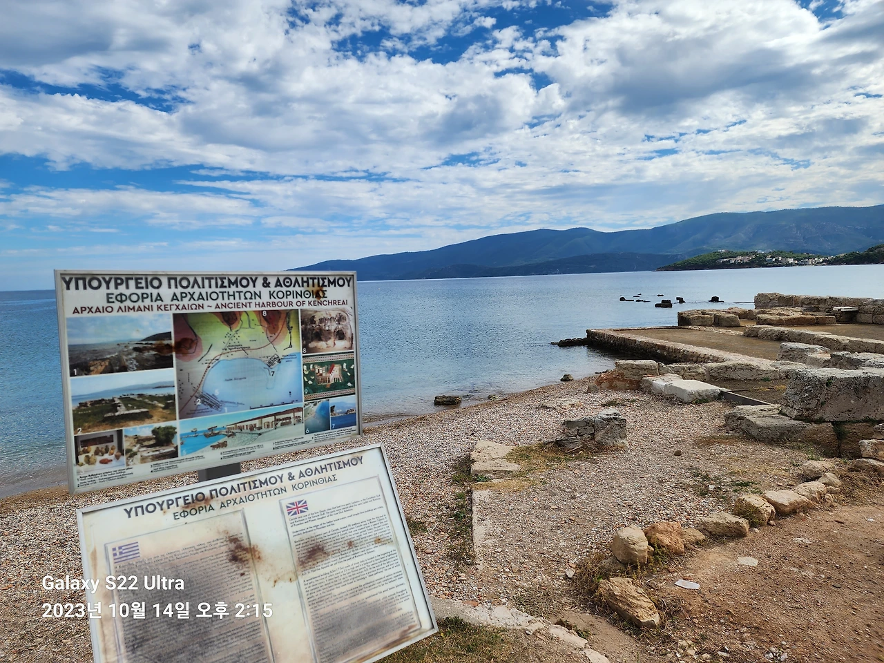 고린도 유적지를 나와 바닷가 식당에서 점심을 먹고 사도 바오로가 전도여행 시 배를 타고 도착했던 켕그레애(겐그리아) 부둣가로 갔다. 조용하고 한적한 해변에 사람들이 수영을 하고 있다. 이곳에 도착한 바오로는 12km를 걸어 고린도에 들어갔고, 이곳에서 시리아로 떠나면서 머리를 깎았다. (사도행전 18장)