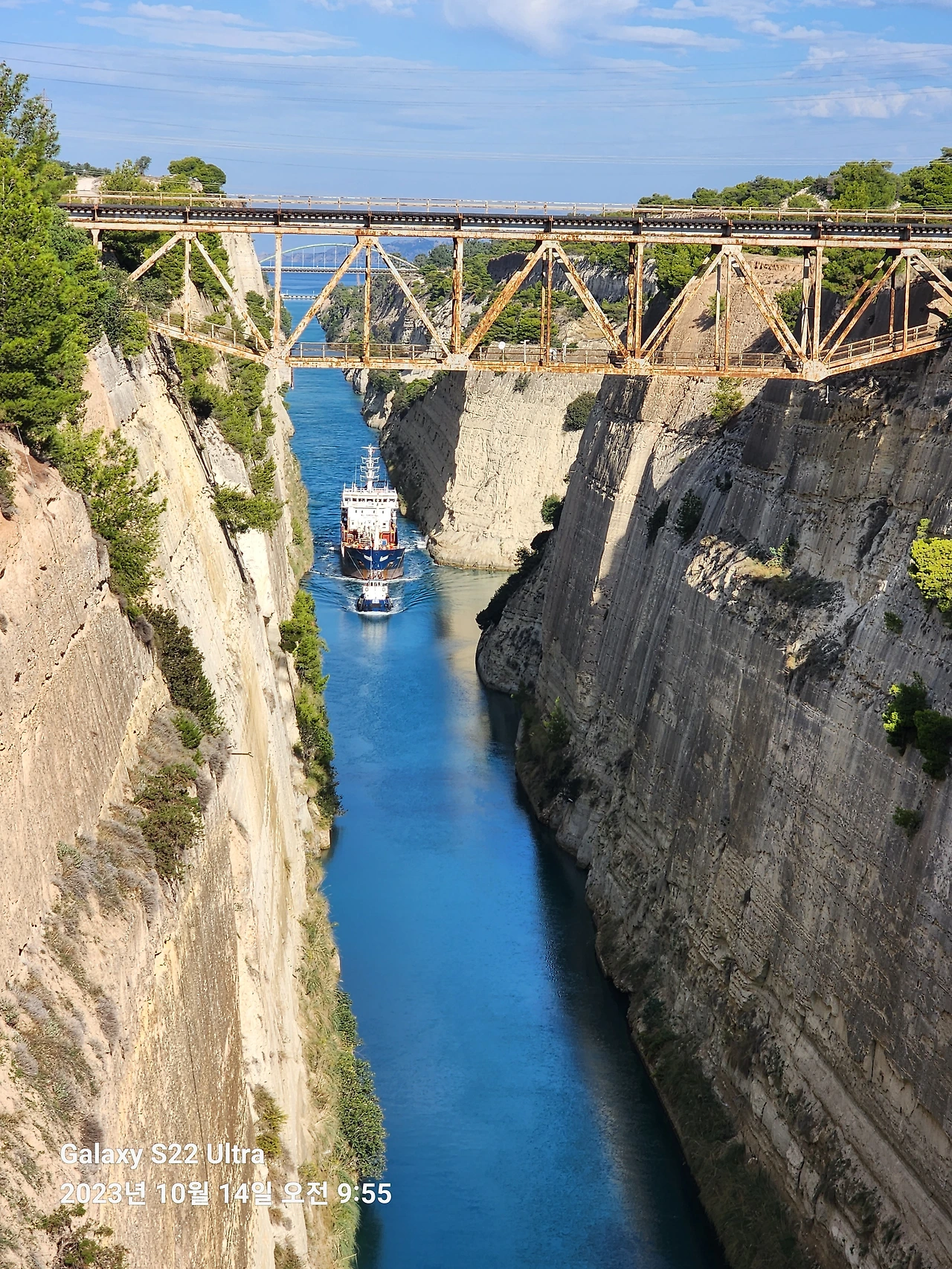 출발 전 사도행전 중에 이곳과 관련이 있는 장들을 찾아 읽었다. 아테네에서 바다를 끼고 한 시간 반을 달려가니 고린도 운하가 나왔다. 에게해에서 이오니아 해까지 필로폰테스 반도를 빙 돌아가는 500km 항로를 6.5km로 단축한 인간의 대역사이다. 운하가 없을 때는 배를 땅 위로 울린 후 굴려서 이동했다고 한다. 메흐메프2세가 1253년 콘스탄티노플성을 공략할 때 바로 이 방법을 사용하였다. 마침 이오니아 해 쪽 입구에서 배가 들어오는 때에 다리를 건너게 되었다. 다리가 바닷물 속으로 빠져들어갔다가 올라오는 시스템라 무척 흥미롭게 보였다.