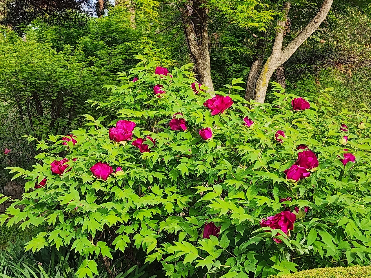 철 이른 붉은 모란꽃이 경내에 여기저기에