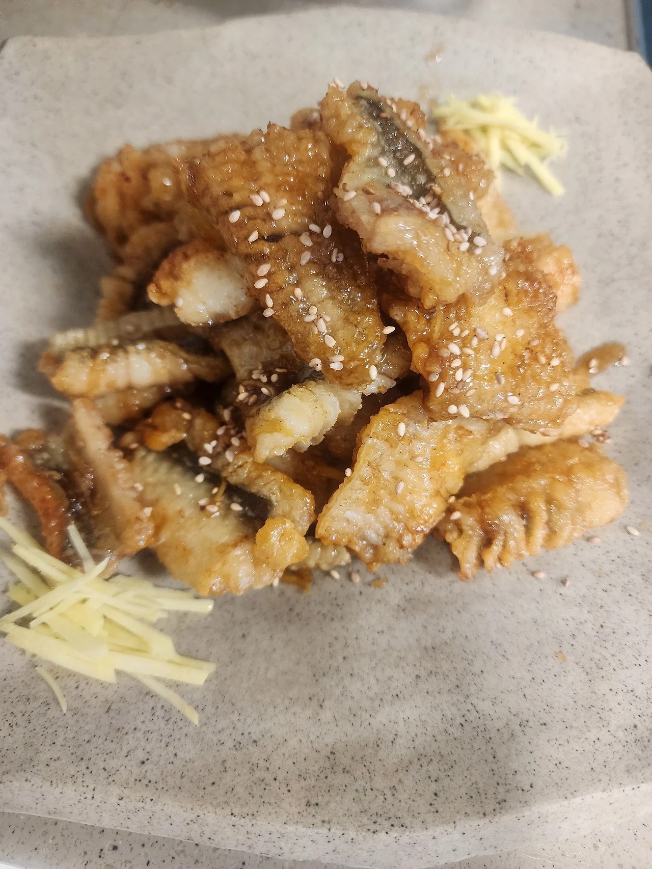 그다음 생일상에 항상 오르는 음식은 잡채와 생선 전이다. 잡채는 고기가 전혀 들어 가지 않은 요즈음으로 치면 완전 웰빙 음식이다. 그러나 생선 전은 기대를 해볼 만하다. 남도 사람들은 서울처럼 생선 전을 포를 떠서 부치지 않고 통째로 부친다. 작은 생선 주로 가자미나 볼락 등을 내장만 제거하고 치자물을 곱게 입힌 후 뒤집어 놓은 솥뚜껑에다 기름을 충분히 올린 후 부친다. 잘 부쳐진 생선 전의 최고 일미는 묘하게도 지느러미 부분이었다.