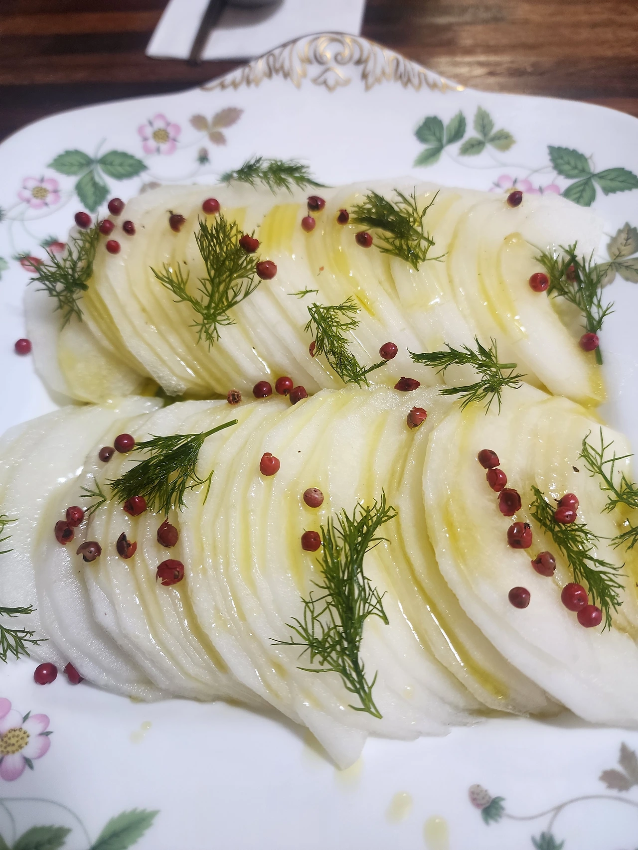 딸이 정성스레 생일 파티 음식을 집에서 직접 준비하였다. 정성이 듬뿍 들어간 흔적을 눈으로, 맛으로 충분히 보고 느낄 수가 있었다. 고맙기도 하고 안쓰럽기도 하였다. 차린 음식 중에 가장 돋보이는 것은 뭐니 뭐니 해도 여수산 갯장어(하모) 요리다. 환상적인 칼자국이 선명하게 드러나 보이는 갯장어는 잔뼈가 너무 많아서 포를 떠서 1 내지는 2mm 간격으로 칼집을 넣어야 제대로 먹을 수 있다.