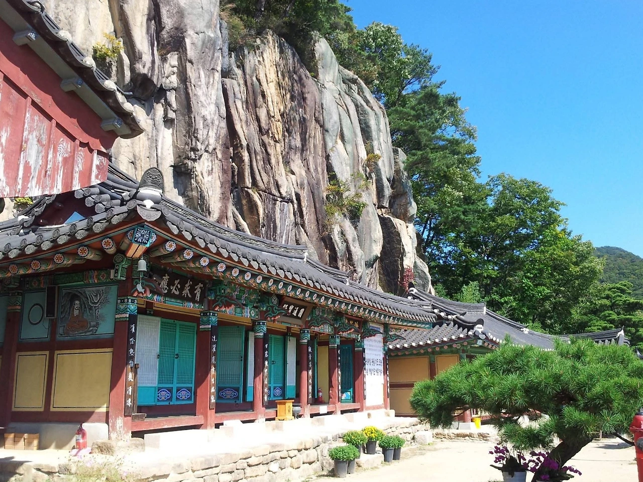 8부 능선, 깎아지른듯한 병풍바위 바로 밑에 요사체가 겨우 비집고 들어가 자리를 잡았다.