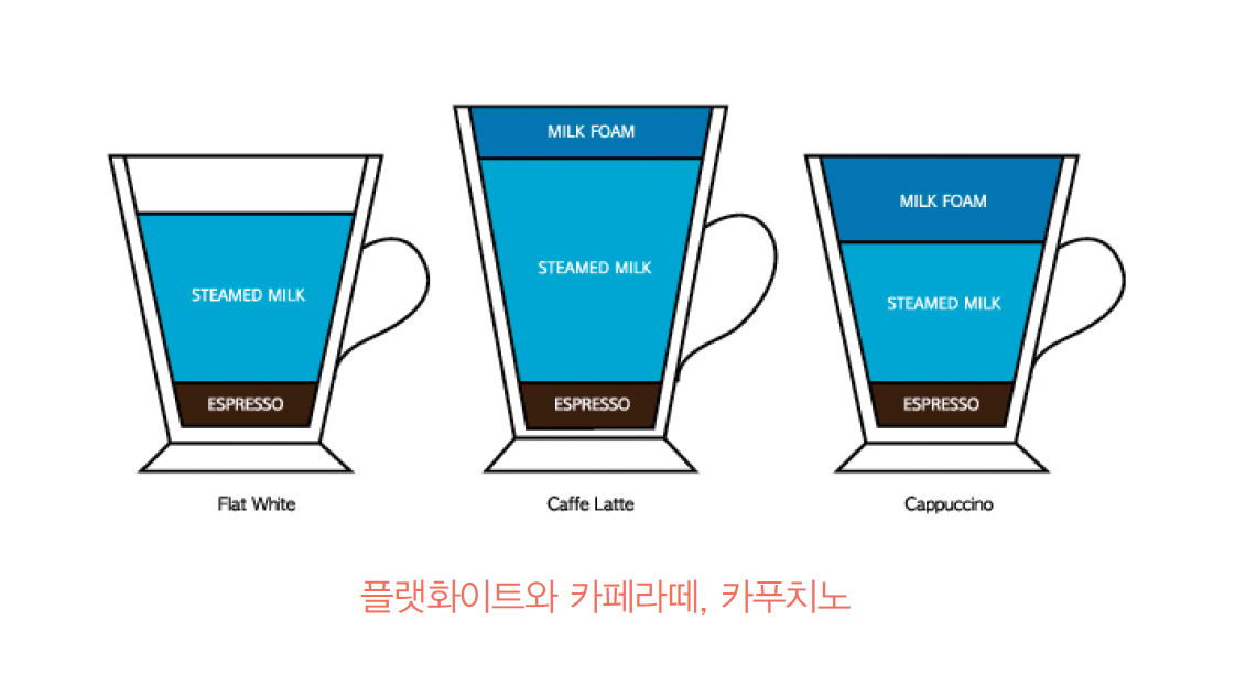 ‘카푸치노’ 하면 입술에 묻힌 하얀 거품이 떠오른다. 카페라떼 역시 부드러운 거품이 가득한 라떼가 생각난다. 카페를 시작하기 전에는 카푸치노와 카페라떼의 차이점을 몰랐다. 카페에서 주문해도 비슷한 것 같아서 그냥 카페라떼를 시키곤 했었다. 카푸치노와 카페라떼의 공통점은 에스프레소에 스팀밀크를 넣는다는 것이다. 그럼 다른 점은 무엇일까? 이름이 다른 이 메뉴들의 차이는 무엇일까?