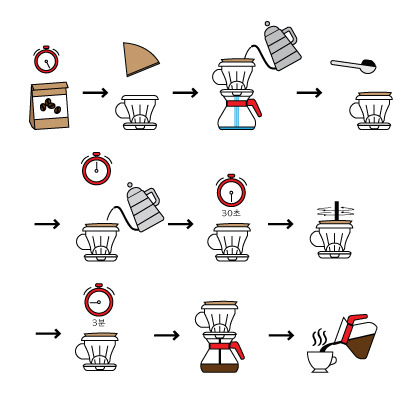5. 93도씨의 물 250ml (1인용 기준)를 드립퍼에 붓고 초시계 시작 버튼을 누른다.