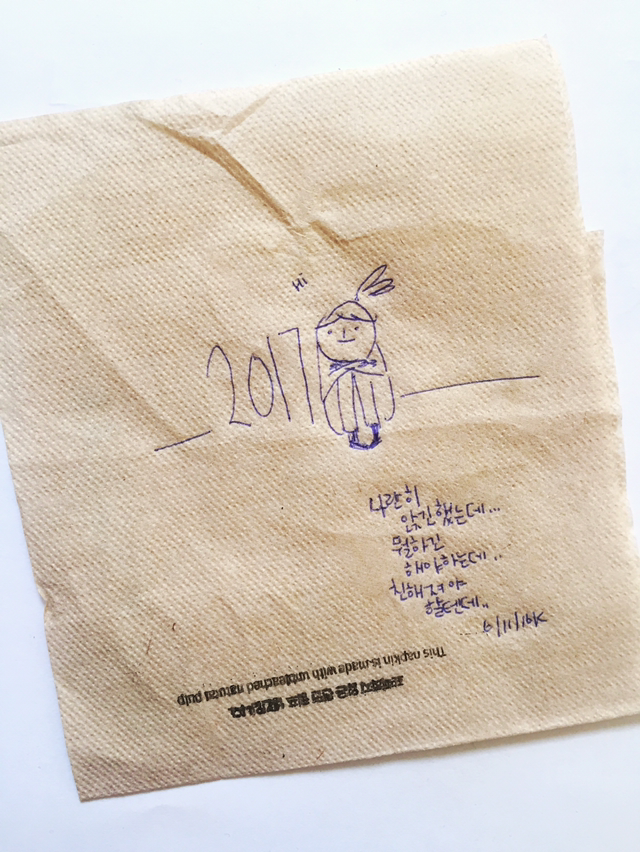 뭐야! 난 아직 마음의 준비도 다 안 끝났는데! 왜 벌써 2017년 첫번째 주week day가 다 끝나가는 거야! 아니야 ㅠㅠ #그림일기 #새해첫주 #작심삼일 #내마음은아직한살더먹을준비아니다ㅠ #냅킨드로잉 #일러스트 #illust #napkin #drawing #visual #diary #허경원