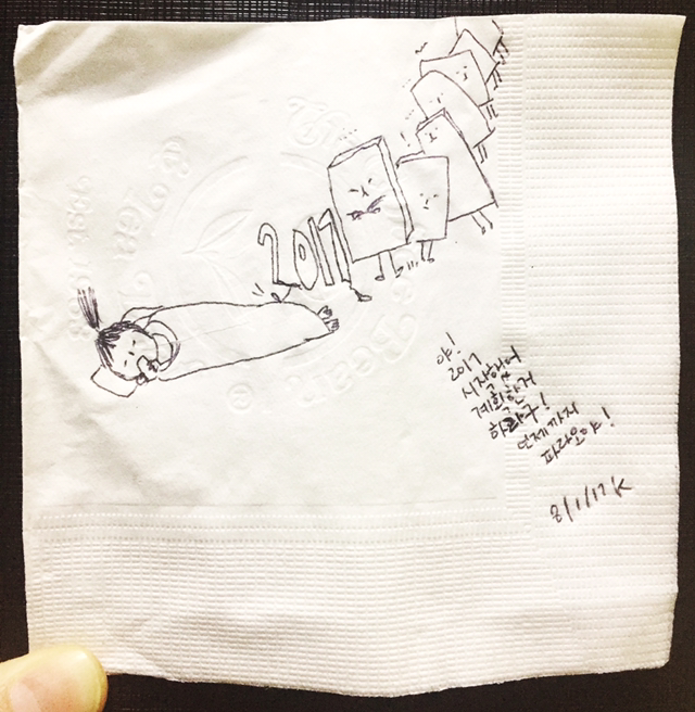 2017: 날 밝았다. 결심한거 하라고.. 야! k:..아멀랑 #그림일기 #냅킨드로잉 #2017 #새해결심 #작심삼일 #아멀랑 #허경원 #허라오 #일러스트 #illust #art #drawing #visual #diary