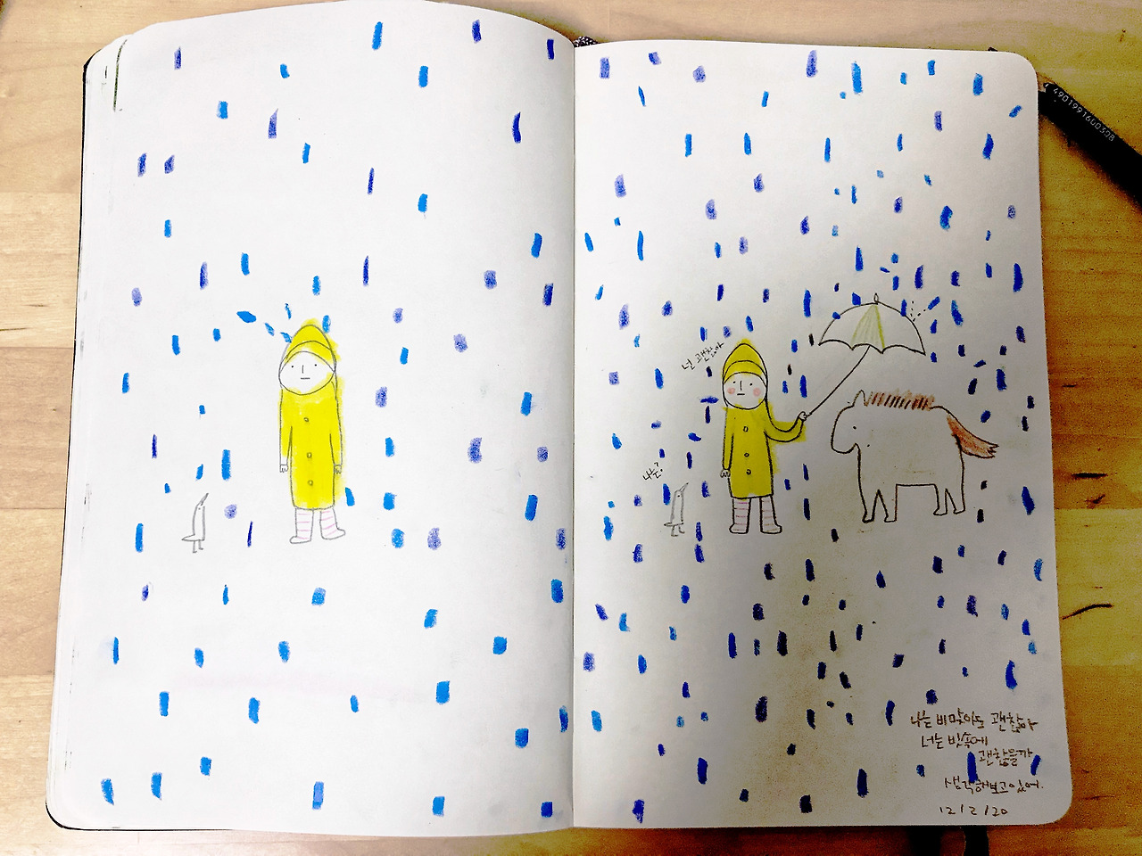 내 그림 속에 비 맞을까 걱정하는 말이 등장할 줄 누가 알았겠어?라고 피식 웃으며 그린 아침 일기.