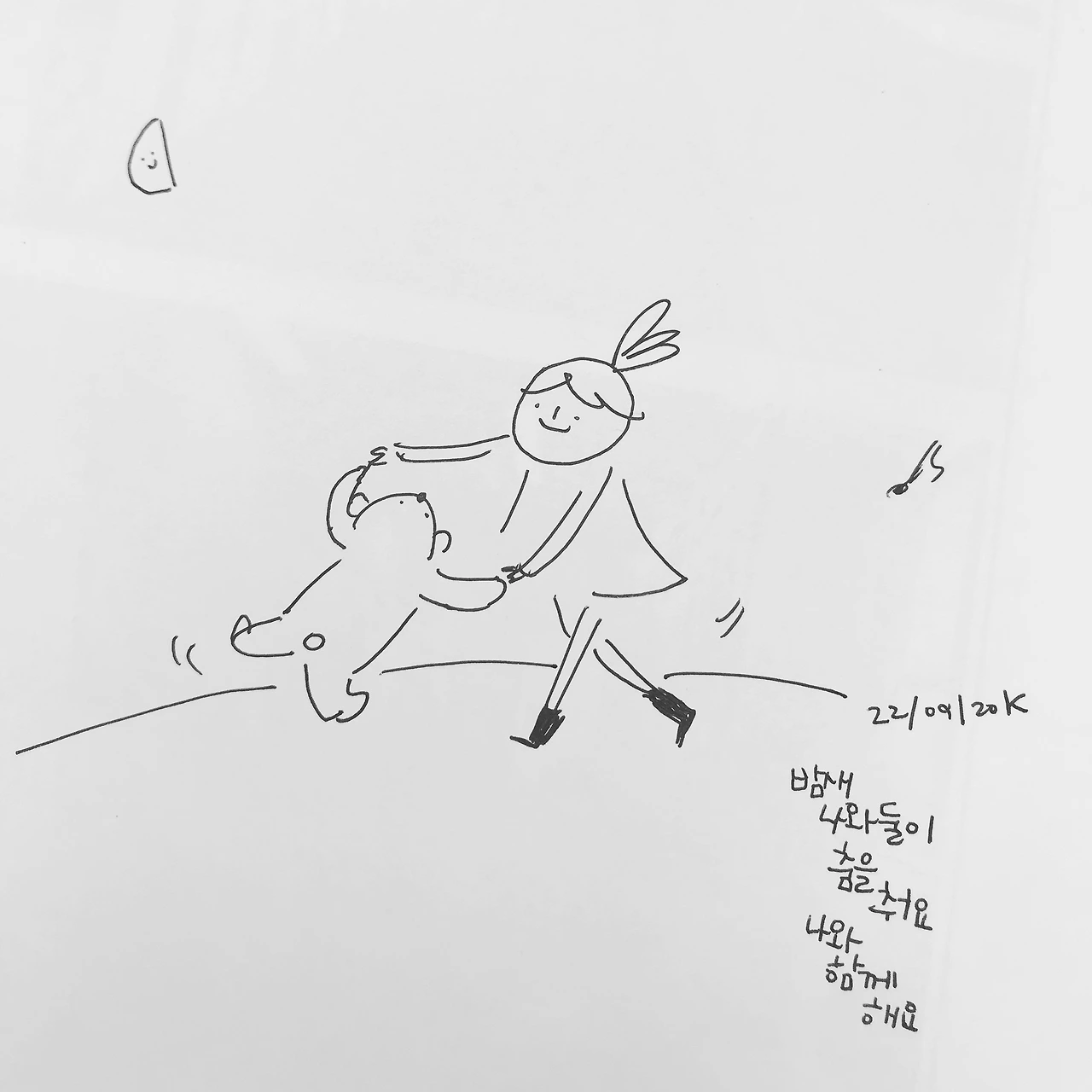 밤새 나와 둘이 춤을 춰요 창문 너머 저 반달이 미소를 지어줄 때까지 나와 함께 해요 나와 함께 해요 -야광토끼, '나와 둘이' #지금내귓가 #에들리는음악 #냅킨드로잉 #일러스트