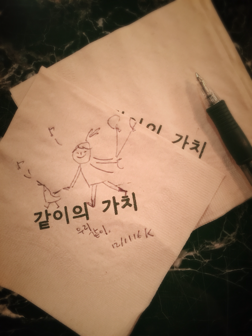 ('같이의 가치' 라고 쓰인 감성넘치는 냅킨을 발견했어요! 그림그리기 신남)