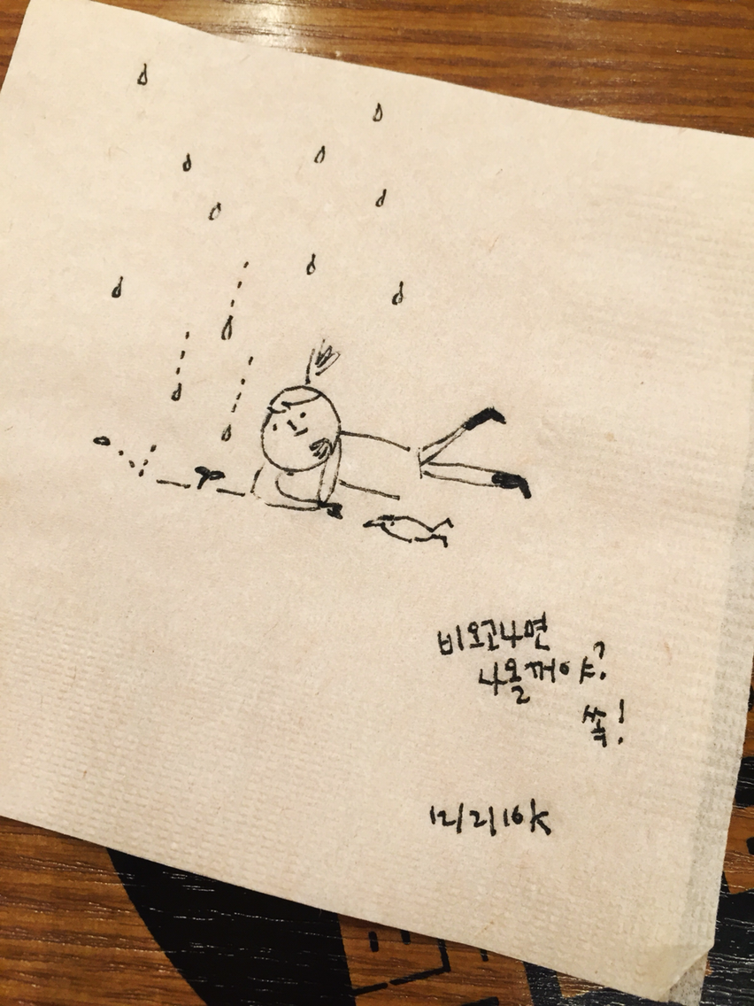 냅킨에 그리는 드로잉, 하루의 그림일기, '지금 내 귓가'에 들리는 음악을 그려요. by 일러스트레이터 허경원