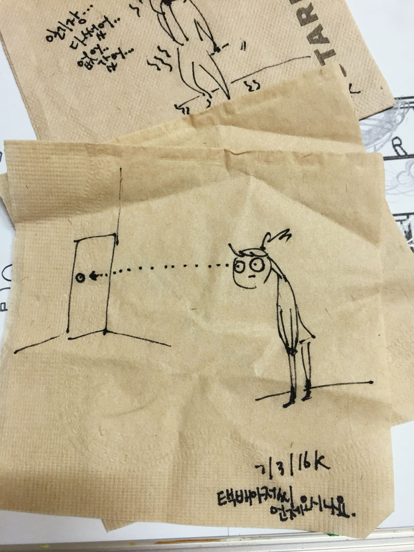 냅킨에 그리는 드로잉, 하루의 그림일기, '지금 내 귓가'에 들리는 음악을 그려요. by 일러스트레이터 허경원