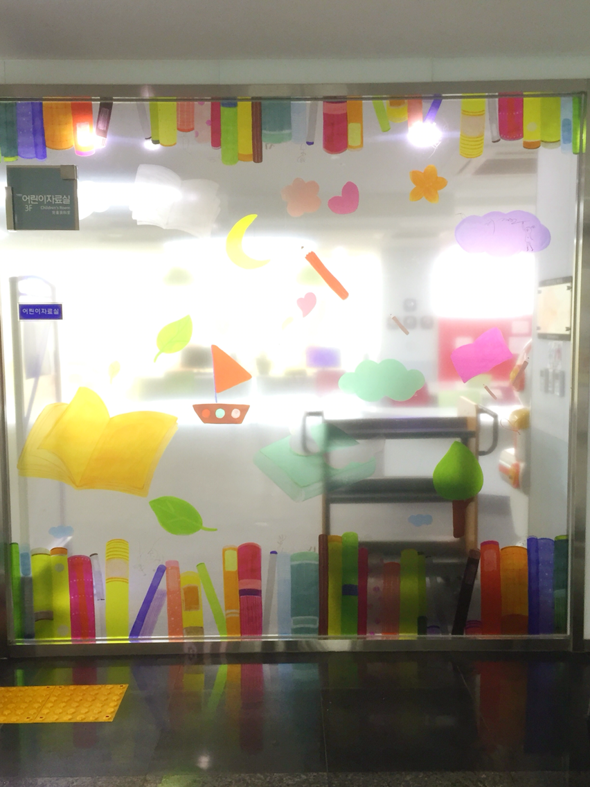 도곡정보문화도서관 어린이열람실의 일러스트레이션 작업을 했습니다따뜻하고 사랑스러운 느낌으로 어린이들이 열람실과 더 친해지길 바라며 작업했습니다 책과 함께 문앞에 리틀케이가