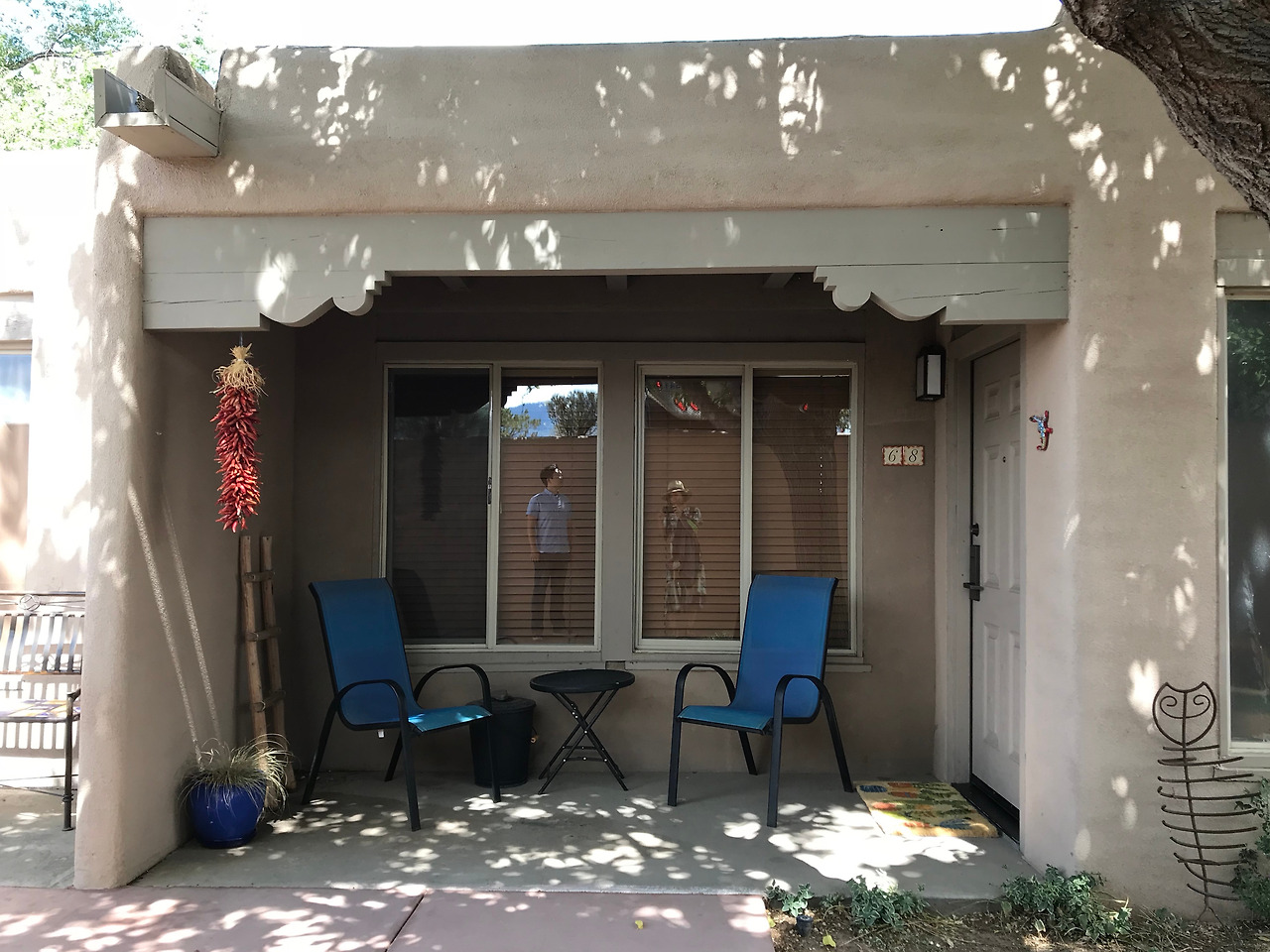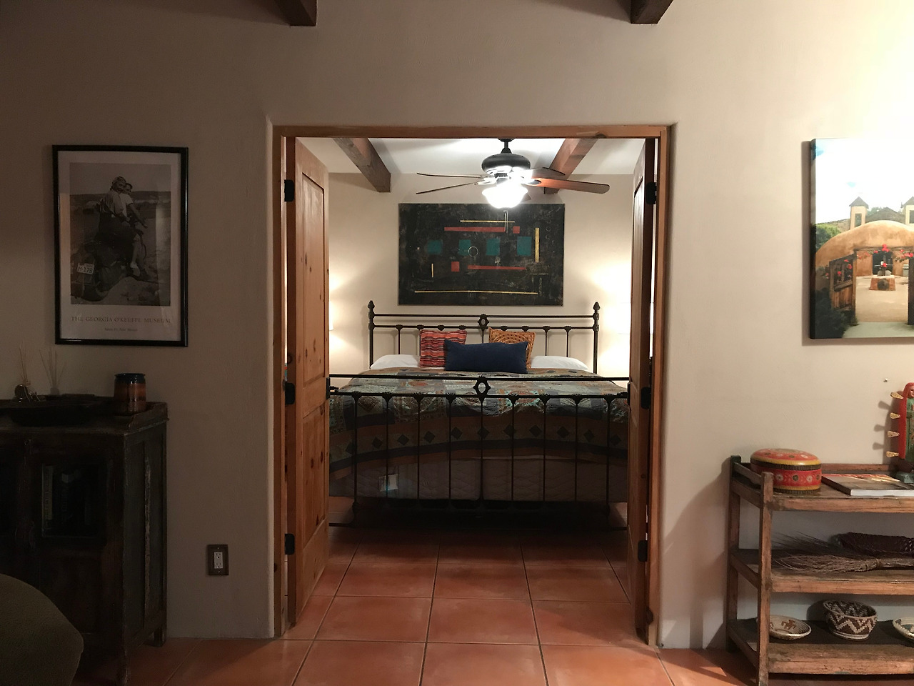 이윽고 소개받은 객실은 남편의 이야기 속에 존재하던 산타페의 모습을 그대로 옮겨 놓은 공간이었다. 흙으로 지은 듯한 아담한 건물과 패티오에 놓인 파란색 의자 한 쌍, 오래된 사다리, 도마뱀 모양의 장식품이 정겨웠다. 그림과 사진, 장식품이 잔뜩 걸린 실내는 정성이 느껴지는 아기자기한 공간이었다. 거실 한쪽 벽에 걸린 조지아 오키프의 흑백 사진을 보고 첫눈에 반했고, 반대편 벽의 둥근 벽난로도 사랑스러웠다.