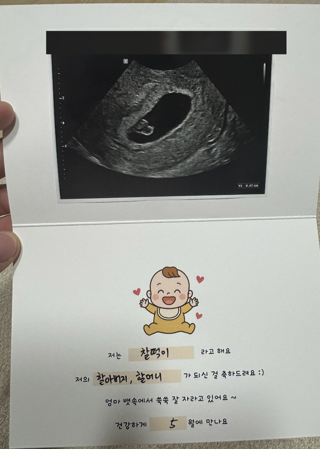 그래서 주변 후기를 보면, 5~6주차에 난황과 아기집을 확인하고, 6~7주차에 심장소리를 들은 뒤에 소식을 전하는 경우가 많다. 기쁜 마음은 백번 공감되지만, 이 시기에는 여전히 조심해야 할 때이기도 하다.