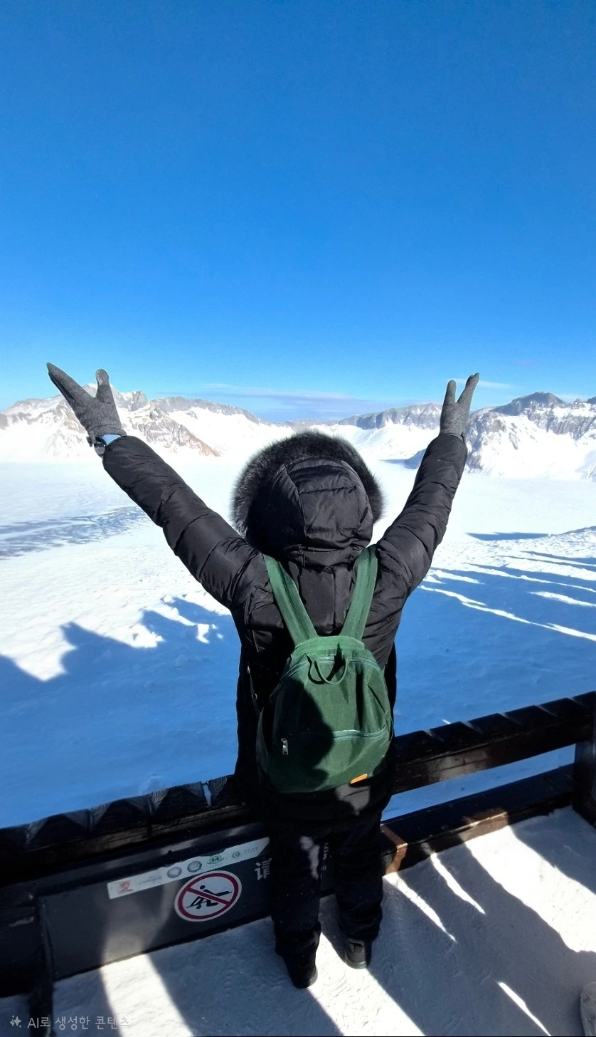 끝없이 펼쳐지는 눈 쌓인 길이 겨울의 천지를 보는 것이 얼마나 하늘의 별따기일지 짐작하게 하였다. 우리는 전열을 가다듬고 단체 사진을 한 컷 찍었다. 천지투어에 1시간 30분이 주어졌다. 천지를 향해 고고씽!