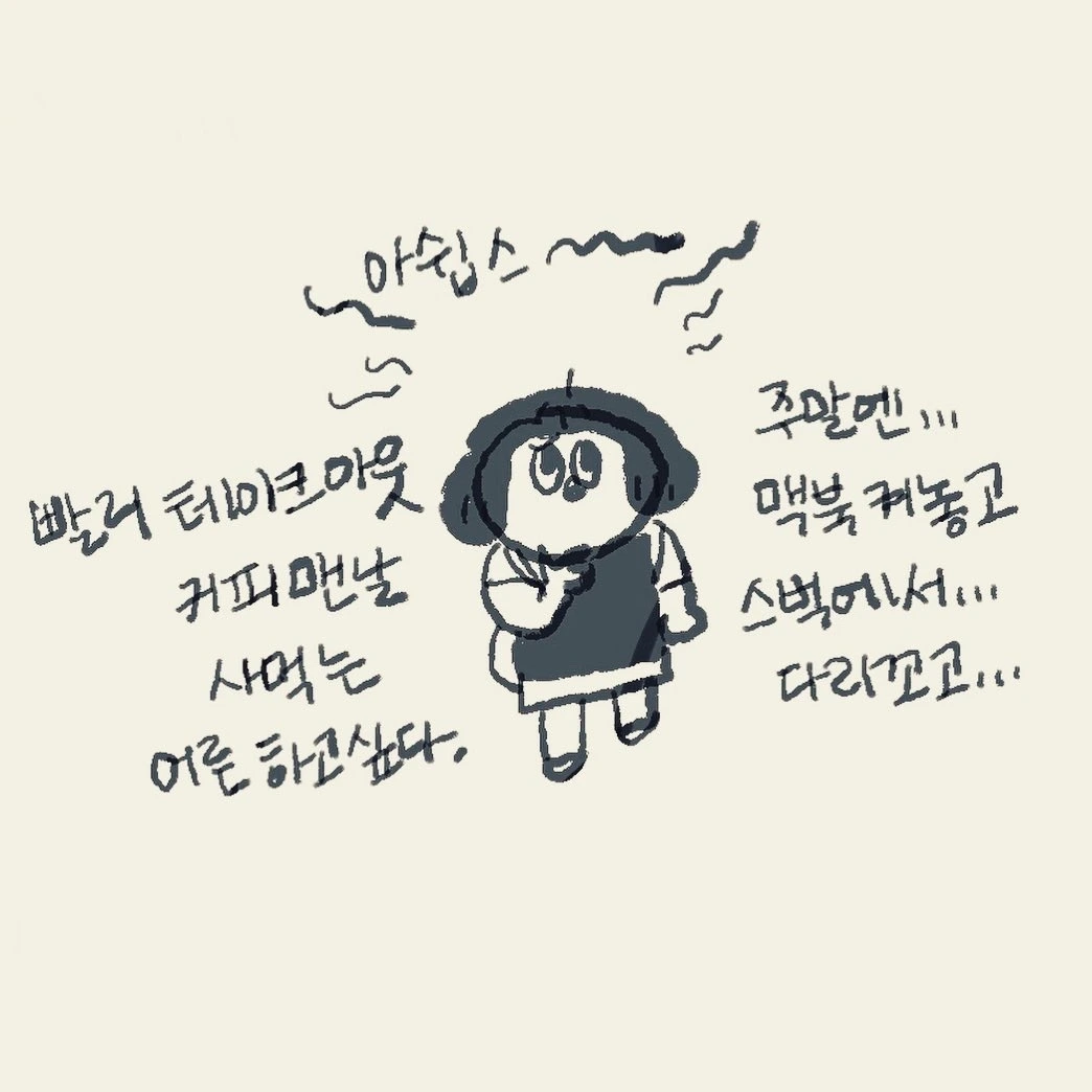 시간이 흐르고 흘러 나는 1층에 별다방이 자리 잡았던 강남 한 오피스에서 첫 근무를 시작하게 되었다. 주말 아침이면 집앞 별다방에서 샌드위치를 씹으며 작업물을 정리하거나 열심히 공부를 하기도 했다. 그러니까 학창 시절의 그 귀여운 소망은 내 생각보다 빠르게 이루어진 것이다.