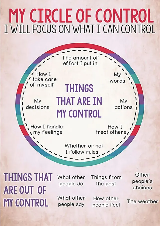 통제의 원 밖의 것들, 이를테면 다른 사람의 말, 행동, 감정으로 인해 스트레스받는가? 그렇다고 해도 당신이 통제할 수 있는 일은 당신의 말, 행동, 감정이다. 책임을 타인에게 돌리지 말아야 할 것이다. 모든 책임이 나에게 있다. 문제의 시선을 타인으로 돌리고 나면 문제는 해결할 수 없게 된다. 그러나 통제의 원 밖의 것들을 무조건 수용하고, 포기해서는 안 될 것이다. 내가 할 수 있는 일을 찾아야 한다.