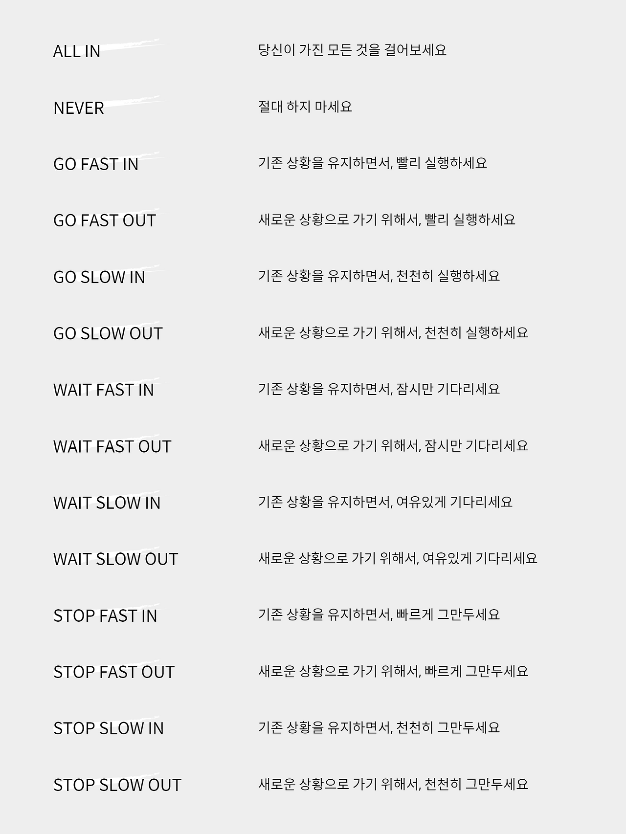 1. 먼저 내가 직면하고 고민하는 상황에 대해, 모든 것을 쏟아부을 것인지 (All-IN), 그만둘 것인지 (NEVER) 판단한다. 그 정도의 사안이 아니라면 다음 단계로 간다.
