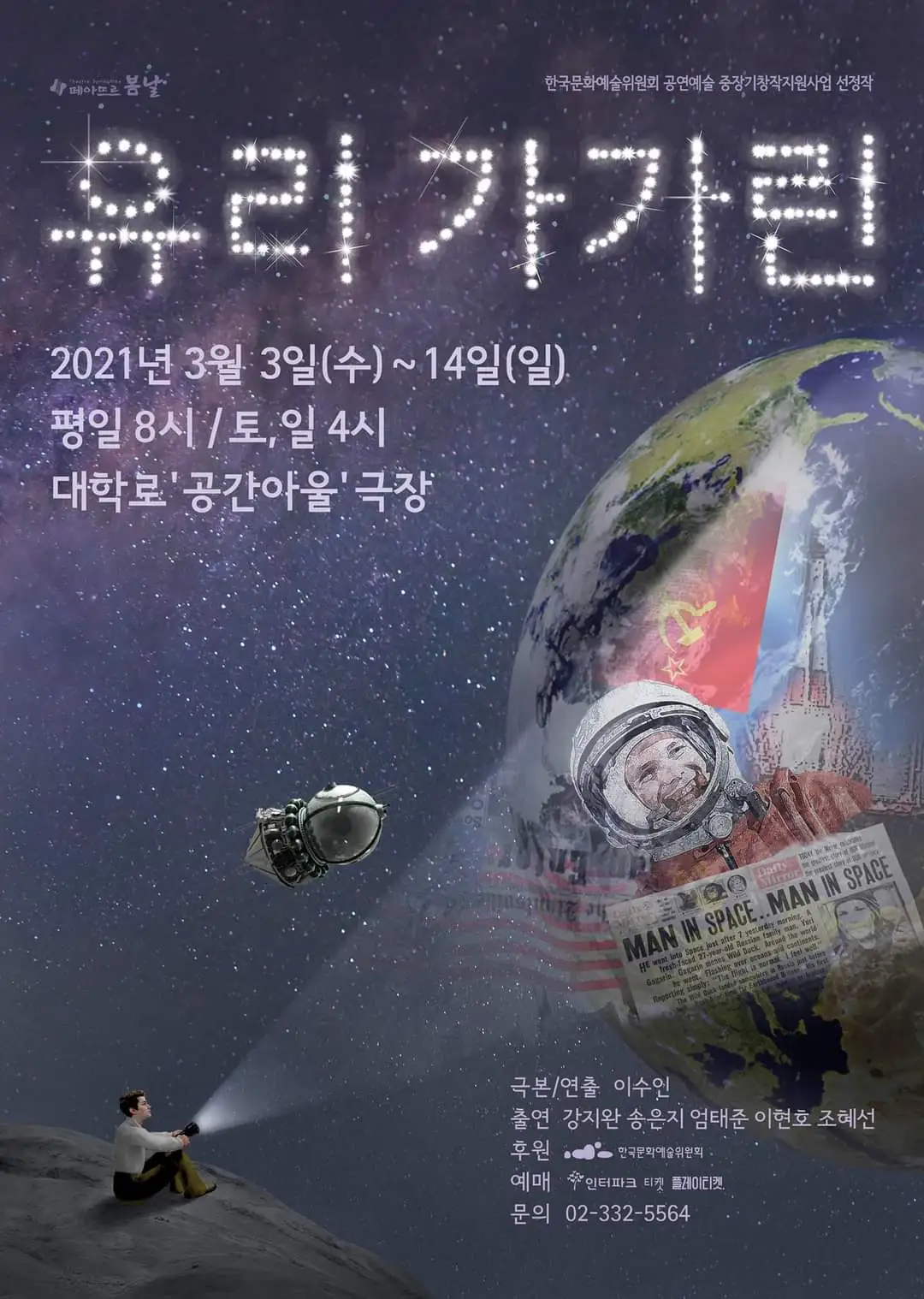1961년 4월 12일 소련의 우주선 보스토크호를 타고 301킬로미터 밖의 지구 궤도를 108분 동안 선회한 최초의 인간에 대한 이야기. 비좁은 공간에 홀로 고립된 채 마주해야 했을 절대고독 속에서 그는 지구를 보며 무슨 생각을 했을까? 극에 달한 엄혹한 냉전 시대 체제 경쟁의 분위기에서, 광활한 우주 속의 작은 별, 그 안에 이념으로, 인종으로, 종교로 나뉘어져 갈등하는 인간의 모습이 약간은 부조리하고 하찮게 느껴졌을까? 실제로 그는 생환 후 '지구는 푸른빛이었다.'는 자전적 수기에서 자신의 소회를 밝혔다고 한다. 쿠바 미사일 위기, 케네디 암살, 미국의 달착륙을 비롯하여 60년대의 세계사적인 사건들을 거시적인 관점에서 세밀하게 묘사한 장면들이 돋보인다. 게다가 영화, 팝음악, 심지어 인터내셔널가와 동요까지 동원하여 당시의 시대와 인물들을 5명의 배우가 숨쉴새 없이 열연하는데 'Retro - Astro - Fantastic - Comedy'라는 홍보 문구에도 불구하고 이야기가 가지는 무게감 때문인지 객석에서는 웃음 소리가 없다. 작은 소극장 무대가 보여준 우주, 어떤 우주적인 관점이 긴 여운을 남긴다. #극단떼아뜨르봄날 #유리가가린 3월 14일까지 대학로 '공간아울' 극장