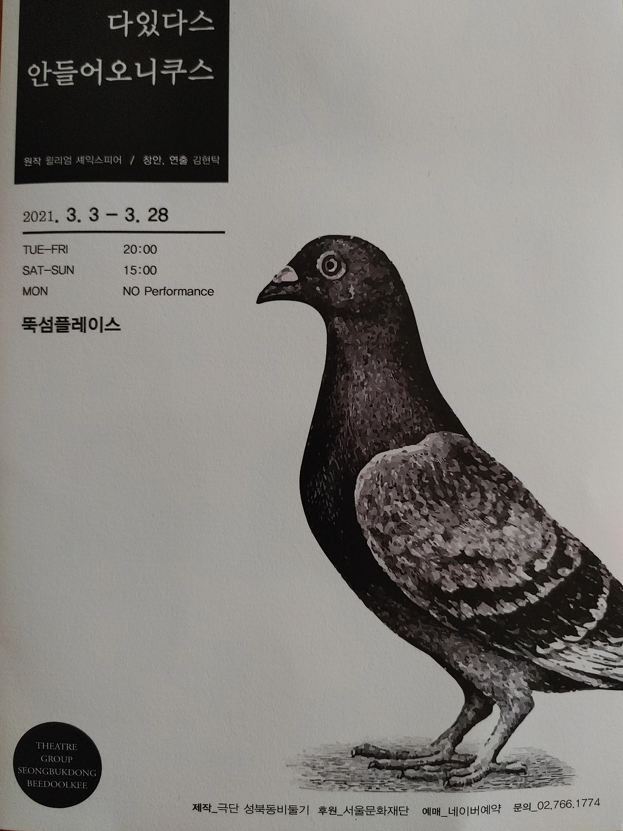 (연극) 다있다스 안들어오니쿠스... 극단 성북동비둘기. 이름으로만 알고 언젠가 한 번 봐야지 했던 극단의 공연을 찾았다. 성수동 골목 구석에 숨어있는 극장을 찾아서 휴대폰을 들고 근처까지 와서도, 두 번이나 전화로 위치를 물어야했다. 2층 창고를 개조한 듯한 극장인데, 공간의 구석구석이 거친 듯 운치있었다. 셰익스피어의 잔혹한 복수극 '타이터스 안드로니커스'를 장난끼 가득하게 비튼 제목에서, 원작을 어떻게 각색했을까 궁금했는데 연극은 원작에서 '복수'라는 키워드 만을 가져와서, 아홉명의 배우들이 돌아가면서, 때로는 세간을 떠들석하게 했던 혜O스님, 유승O, 나훈O 등을 소재로 한 정치와 세태풍자로, 때로는 사적인 독백으로 풀어갔다. 풍자가 얼마나 적확하고 성공적이었느냐와는 별도로 '재현연극과 퍼포먼스의 중간' 어디 쯤에 있을 독특한 형식이 흥미로웠다. 크게 주목받거나 성공하지는 못하더라도 자기만의 방식대로 발랄하게 연극을 하는 고집스런 삶의 방식 지지합니다~~