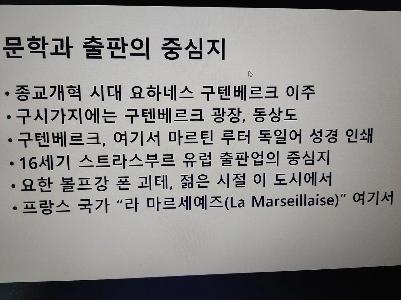 네 번째 도시는 독일과 프랑스의 접경지역에 있는 프랑스의 스트라스부르다. 역사적으로 프랑스와 독일간의 영토분쟁이 끊이지 않았던 곳인데, 현재는 30만의 작은 인구에도 불구하고 EU의 집행부와 의회 뿐만 아니라 유럽 인권재판소가 있는 가히 통합 유럽의 중심도시이다. 일찌기 842년 프랑스어로 쓰인 최초의 공식문서였다는 '스트라스부르 서약'이 체결되었고, 1201년 왕과 영주들로부터 자유도시로 인정받은 후, 이 도시는 학문과 예술, 출판이 번영을 누렸다고 한다. 구텐베르크가 루터의 독일어 성경을 인쇄한 곳도 이곳이었고, 자화상으로 유명한 독일의 화가 알브레히트 뒤러와 괴테도 젊은 시절을 이 도시에서 보냈으며, 프랑스의 국가 '라 마르세예즈'도 이 도시에서 탄생했다. 현대에 들어서는 전유럽을 강타한 6.8운동의 견인차 역할을 한 곳도 바로 스트라스부르 대학교였다고 한다. 놀라운 사실은 예전에 우리 국어교과서에도 실려서, 나라와 모국어를 잃은 백성들 이야기라는 점에서 많은 사람들의 공감을 얻은 '마지막 수업'의 작가 알퐁스 도데가 진실을 왜곡한 극우 쇼비니스트였다는 사실이었다. 당대 그 지역의 모국어는 오히려 독일어였고, 프랑스적인 애국심은 지나치게 왜곡되고 과장된 것이었다고... 브렉시트로 영국이 탈퇴하고, 회원국들 간의 경제적 격차, 헤게모니 쟁탈전으로 통합의 어려움을 겪고 있는 EU의 앞날을 세계인들과 더불어 세심하게 지켜볼 일이다. 이제 다음 주 마지막 도시는 프라이부르크로!!