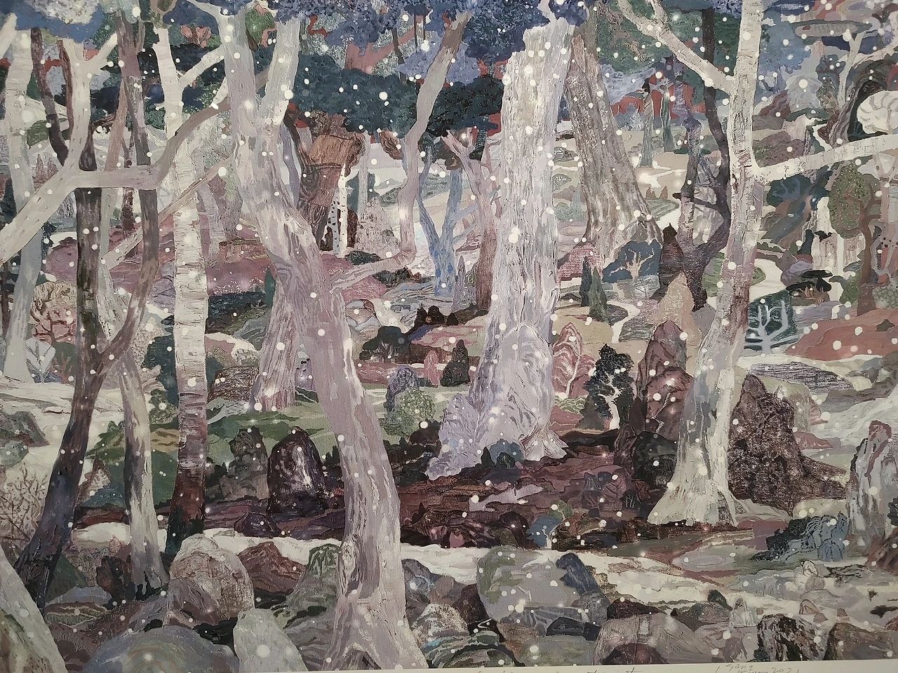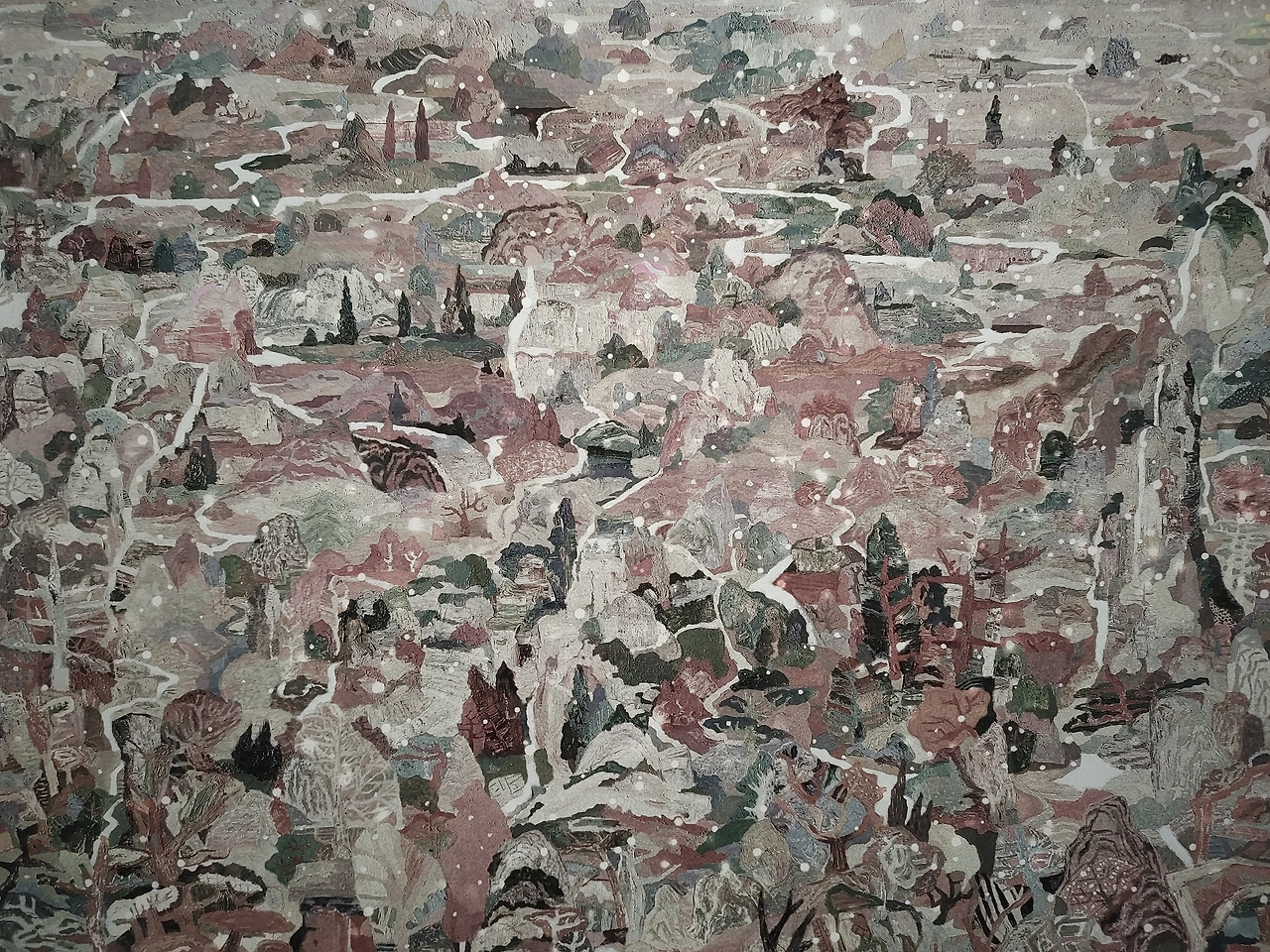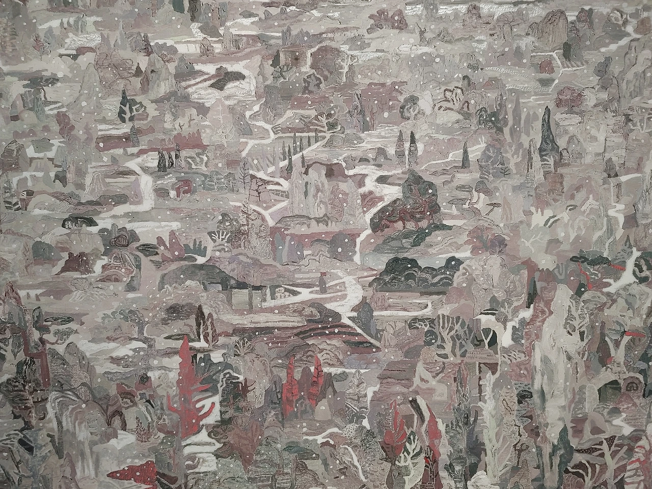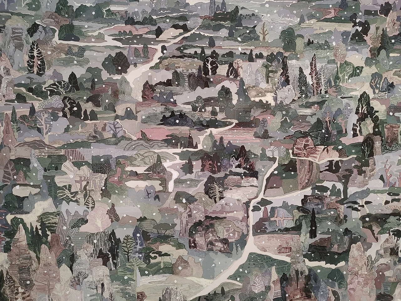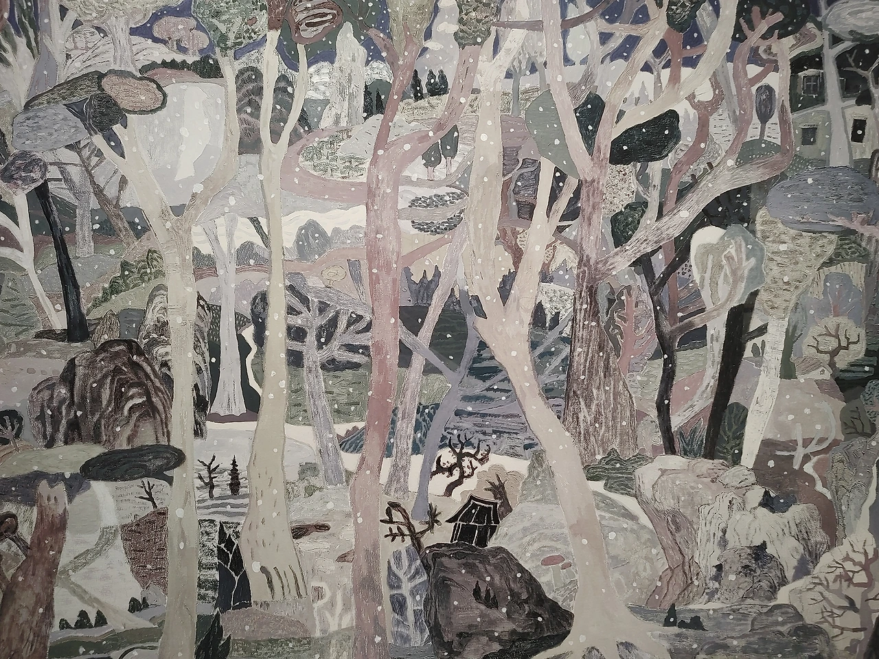 불교의 탱화같기도 하고, 십장생도 같기도 한, 눈내리는 마을 풍경에 나무와 돌과 좁은길들이 엉키어 끝없이 이어져 있다. 겨울풍경인데도 왠지 따듯한 느낌... 5/14일까지 아트노이드 178