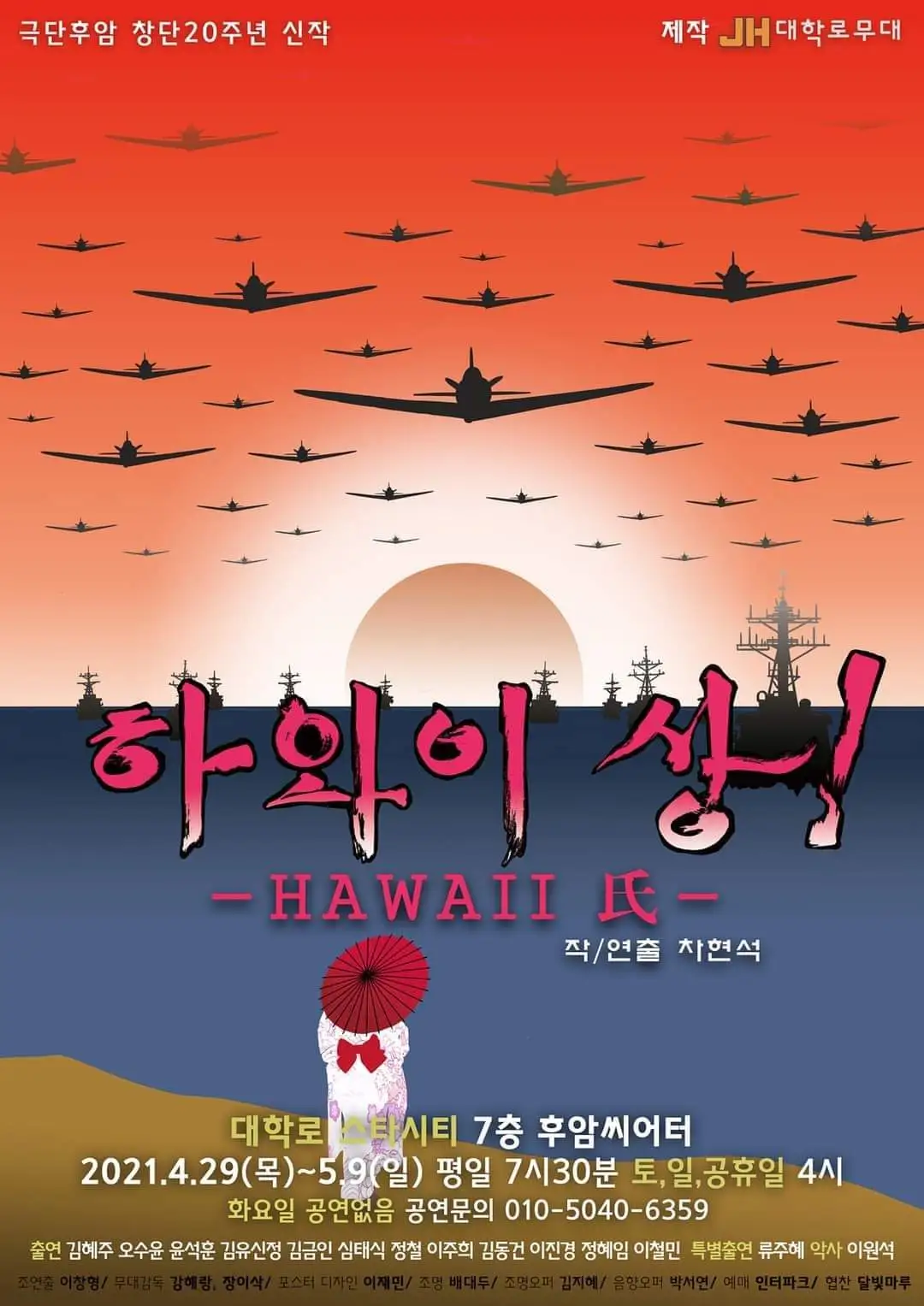 1941년 12월 7일, 일본의 진주만 공습이 있던 날, 하와이 진주만에 있는 '유일한' 일본식 선술집의 하루를 연극은 흥미롭게 재현한다. 전쟁을 피해 하와이로 건너와 억척스럽게 살아남기 위해 분투하는 일본 사람들, 일본계 미국인 소령과 사랑을 시작하려는 게이샤 세이코, 그녀를 사랑하는 일본인 스파이 미스터 하와이... 한치앞에 다가온 거대한 비극을 외면한 채, 다양한 인간군상들과 그들의 얽힌 관계가 사실적으로 그려진다. 진주만 공습을 예고하는 미스터 하와이는 고향인 나가사키로 돌아가자고 세이코를 설득하는데, 이는 이들에게 애초에 전쟁의 비극을 피하는 탈출구 따위는 없음을 암시하고 있다. 결국 예정된 비극은 그들을 덮치고... 당시의 시공간에 존재했을 듯한 실감나는 인물묘사와 당대 일본인들의 멘탈리티를 생생하게 보여준 장면들이 인상적이다. 다만, 어쩌면 일본인의 이름으로 공습기에 타고 있었을, 혹은 기존에 하와이에 이주해 있었던 조선인들의 관점이나 목소리가 작품 어디에도 존재하지 않은 점이 아쉬웠다.