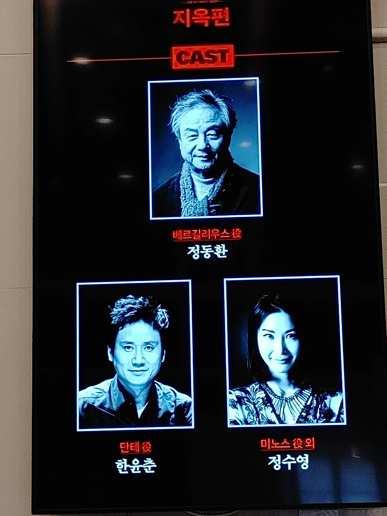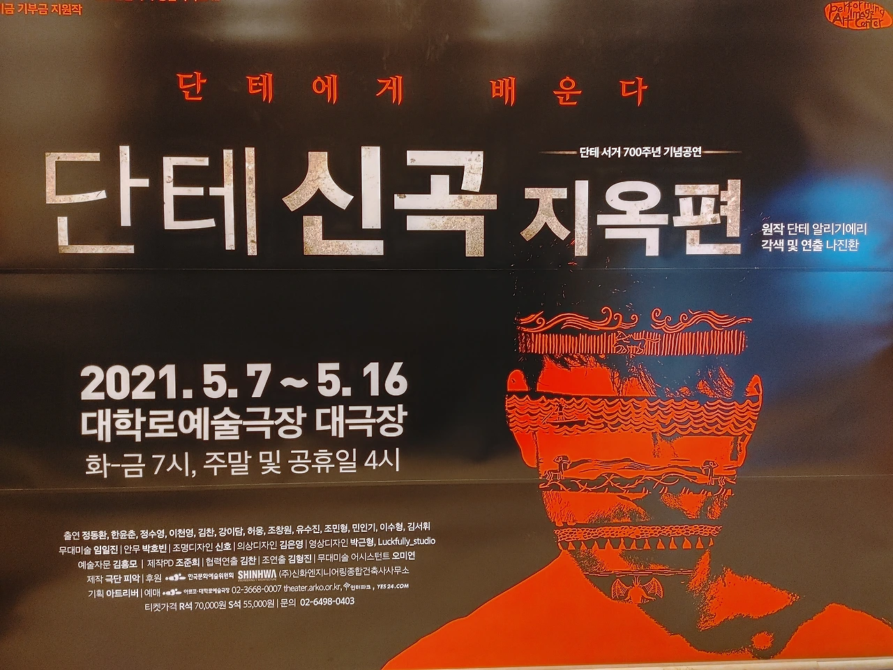 베르길리우스의 안내를 따라서 단테와 함께 떠나는 3시간의 지옥여행. 20여개의 장면으로 표현된 아홉 가지 지옥의 풍경은 디지털 조명, 영상, 무용 등의 수단을 동원하여 다채롭지만 절제된 표현으로 강력하게 객석에 전달된다. 오늘 공연에선 약간의 기술적 문제가 있었지만, 배경에 깔린 20세기의 영상들은 그리스 로마 이후 신화, 종교, 천문학 등 서양의 문명사를 아우르는 이 고전이 단지 700년전 서양의 역사에만 머무르는 것은 아님을 선뜻 깨닫게 했다. 가히 연극이 해설해 주는 서양 고전의 한 진풍경이다. 5/16일까지 대학로 예술극장 대극장