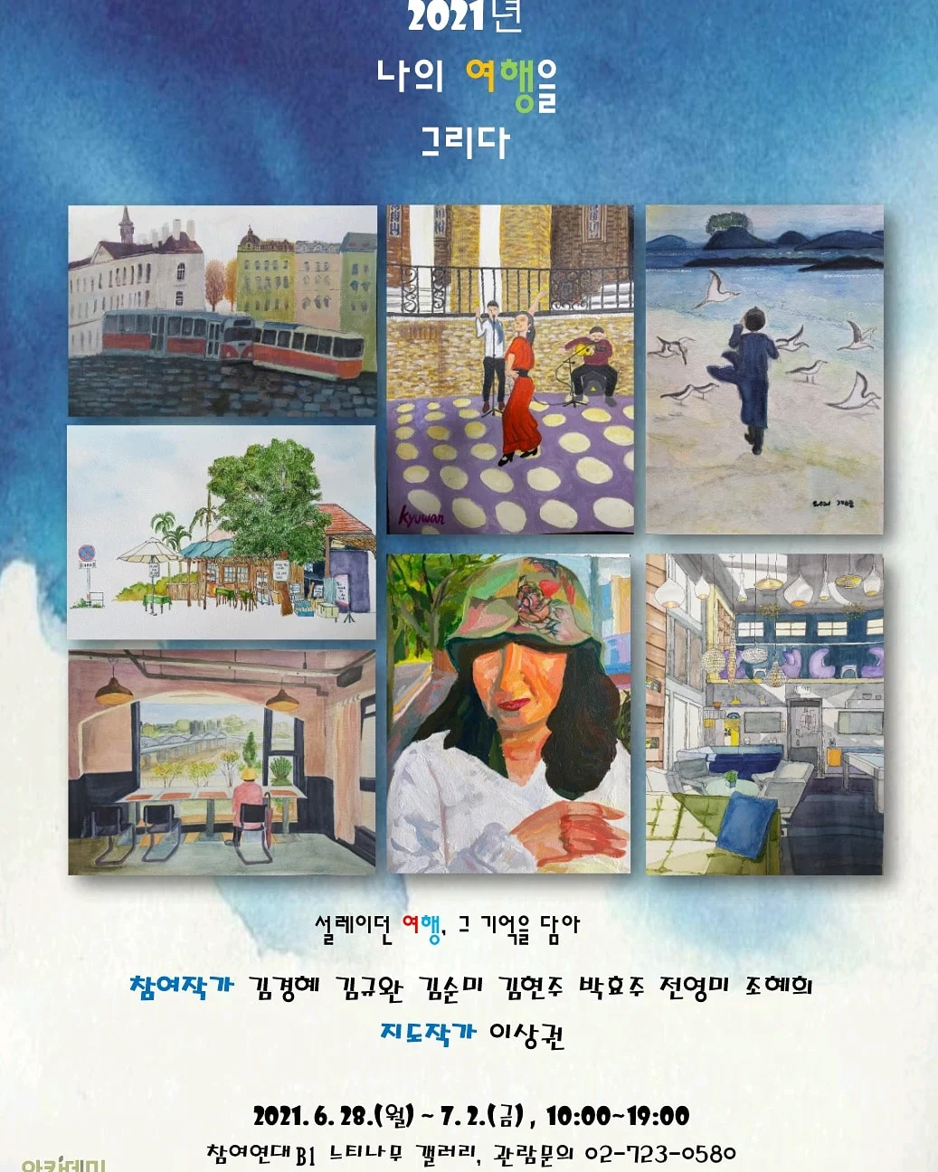 참여연대 아카데미 느티나무에서 '2021년 나의 여행을 그리다'는 주제로 화가 이상권선생님과 더불어 한 학기 동안 진행된 미술학교의 마무리로, 닷새(6/28~7/2, 오전 10시 ~ 오후 7시) 동안 조촐한 그림 전시회가 열립니다. 저는 취미로 그림을 시작한지 이제 일 년 조금 넘은 아마추어 초보에 불과하지만, 다른 분들은 이미 이 아카데미에서 몇 년 째 그림을 그려오신 베테랑들이십니다. 일부러 나오실 것 까지는 없지만, 혹시 경복궁역 근처를 지나신다면 잠깐 들르셔서 격려해 주시면 감사하겠습니다. ^^;; 오시기 전에 관람이 가능한 시간인지 포스터에 적힌 번호로 전화 한 통, 해 주세요. 가끔 회의실로 사용되는 시간도 있다고 하네요. ^^