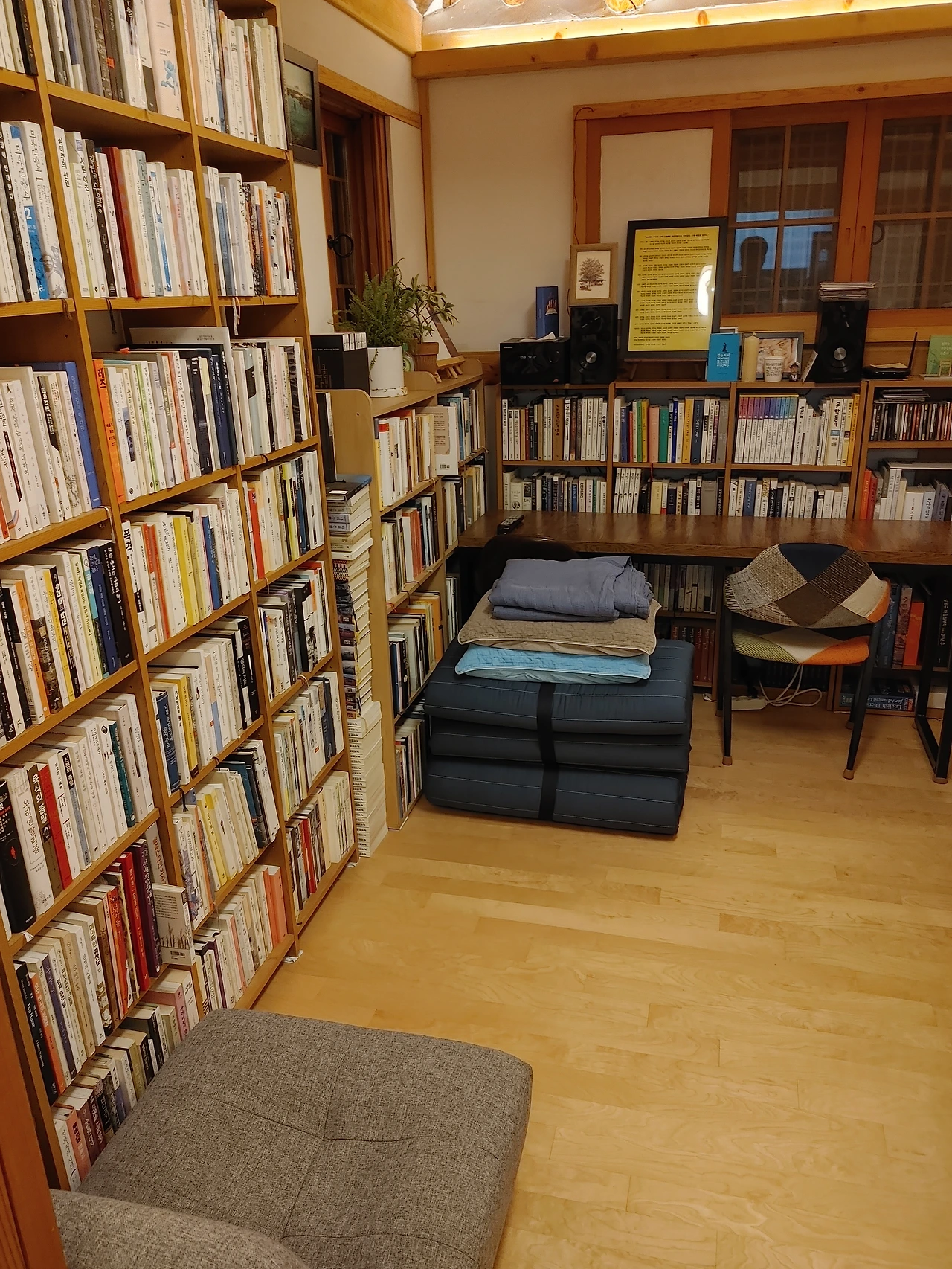 낯 선 곳에서 책과의 하룻밤. 누하동의 한 한옥공유서재에 왔다. 눈이 가는 공간 마다 빼곡히 책으로 둘러싸인 아담한 한옥에 내일 아침까지 온전히 갇혀(?) 책과 더불어 하룻밤을 보내는 프로그램이다. 내일아침까지는 내가 이 공간의 완벽한 주인! 한옥에서 잠을 자는 것도 실로 오랜만이지만 종로 한복판의 막다른 골목길에서 느끼는 이 적막함과 한적함이라니... 표지와 제목이 낯익은 읽은 책부터, 제목만 알고 있는 책, 처음 보는 책... 어떤 책부터 읽어볼까나?