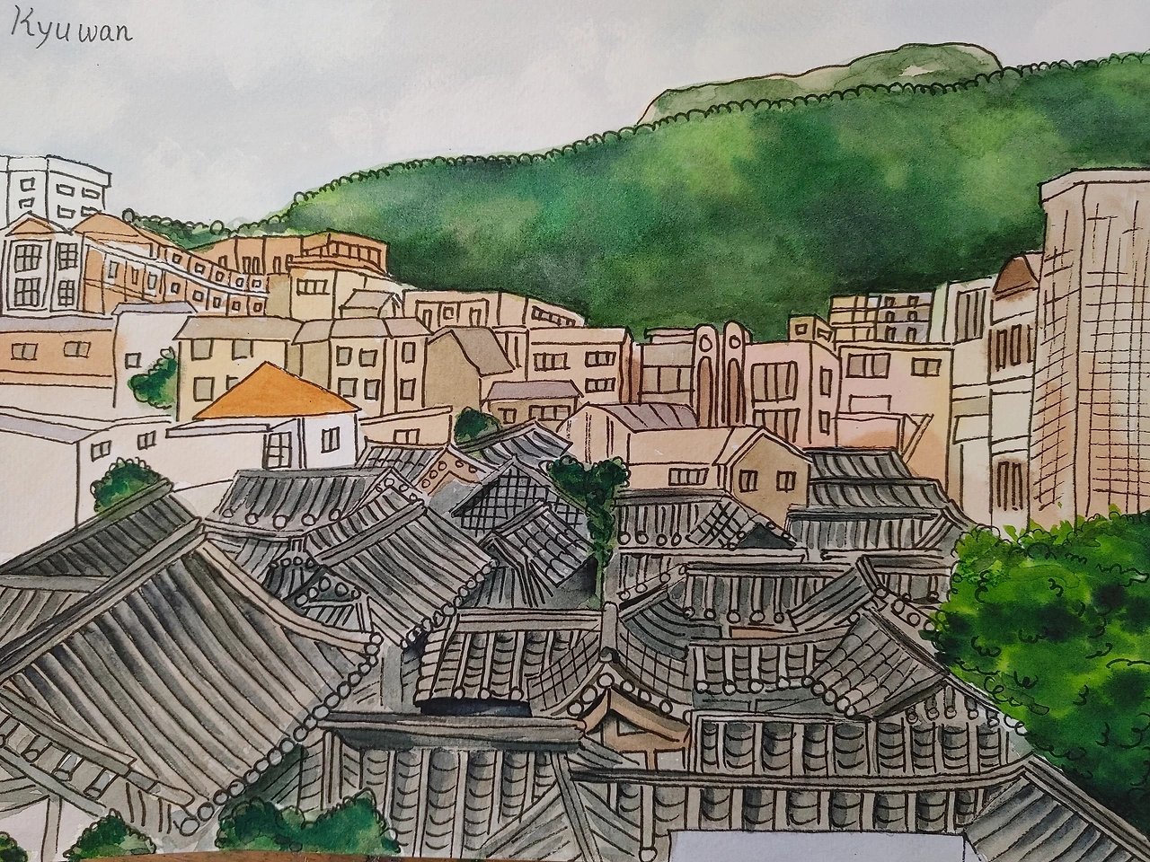 종로구 누하동 풍경. 종이에 펜, 수채... 빽빽한 한옥 지붕에 이어 지은 근대식 건물들이 지난했던 한국현대사를 보는 거 같다. 물의 번짐을 이용한 습식 수채화 기법을 연습!
