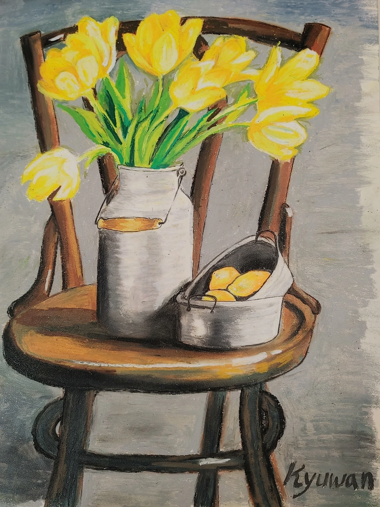 꽃과 과일이 있는 정물... 종이 위에 오일 파스텔, 색연필 ... 처음으로 오일 파스텔로 그림을 그려 봤다. 뭉툭한 크레파스 느낌으로 섬세한 표현이 어려워 세부적인 묘사는 색연필로 커버. 파스텔이라서 색이 잘 번질 줄 알았는데 오일성분 때문에 잘 번지지 않고 번져도 색감이 탁하다. 왠지 나와는 안맞는 듯 한... ^^