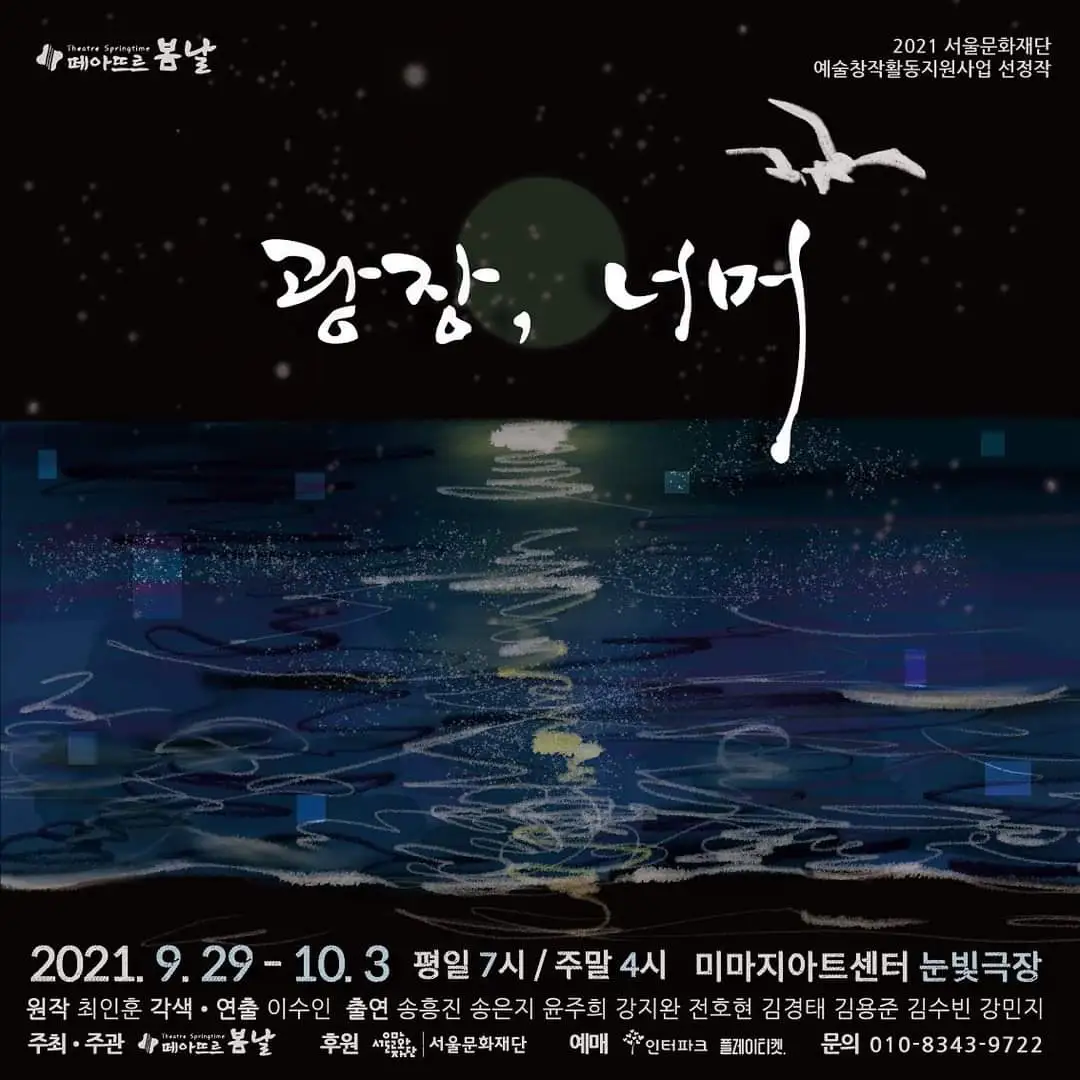 (연극) 광장, 너머... 한반도 종전선언이 아직도 정치권에서 논란인걸 보면 아직도 우리는 전쟁이 끝나지 않은 휴전상태로 하루하루를 보내고 있는 듯 하다. 해방과 분단, 전쟁으로 이어지는 역사를 피끓는 20대의 나이에 통과해 온 지식인 청년 이명준의 이야기가 연극으로 공연되었다. 한국 현대문학사의 고전 최인훈의 '광장'과 그 주인공 명준의 머리속에서 일어나는 상념과 관념적인 갈등을 90분으로 축약해서 공연하는 불가능한 일을 실행에 옮긴 이들은 떼아뜨르 봄날! 별다른 무대장치나 소품 없이 팝송,가요, 샹송을 넘나드는 음악과 배우들의 목소리와 연기만으로 지난했던 역사적 배경과 인물들을 속도감 있게 인상적으로 요약해 냈다. 마치 분단을 주제로 2021년의 시민들에게 보내는 발제문을 연극으로 보여준 듯한 느낌. 명준의 방황이 끝난지도 70년이 다 되어가는 오늘날에 세상은 그때와 얼마나 달라졌는지, 전쟁은 우리에게 또 무엇을 남겼는지, 지금의 20대들은 무슨 생각을 하며 청춘의 터널을 통과하고 있을지 착찹한 마음으로 극장 문을 나섰다.