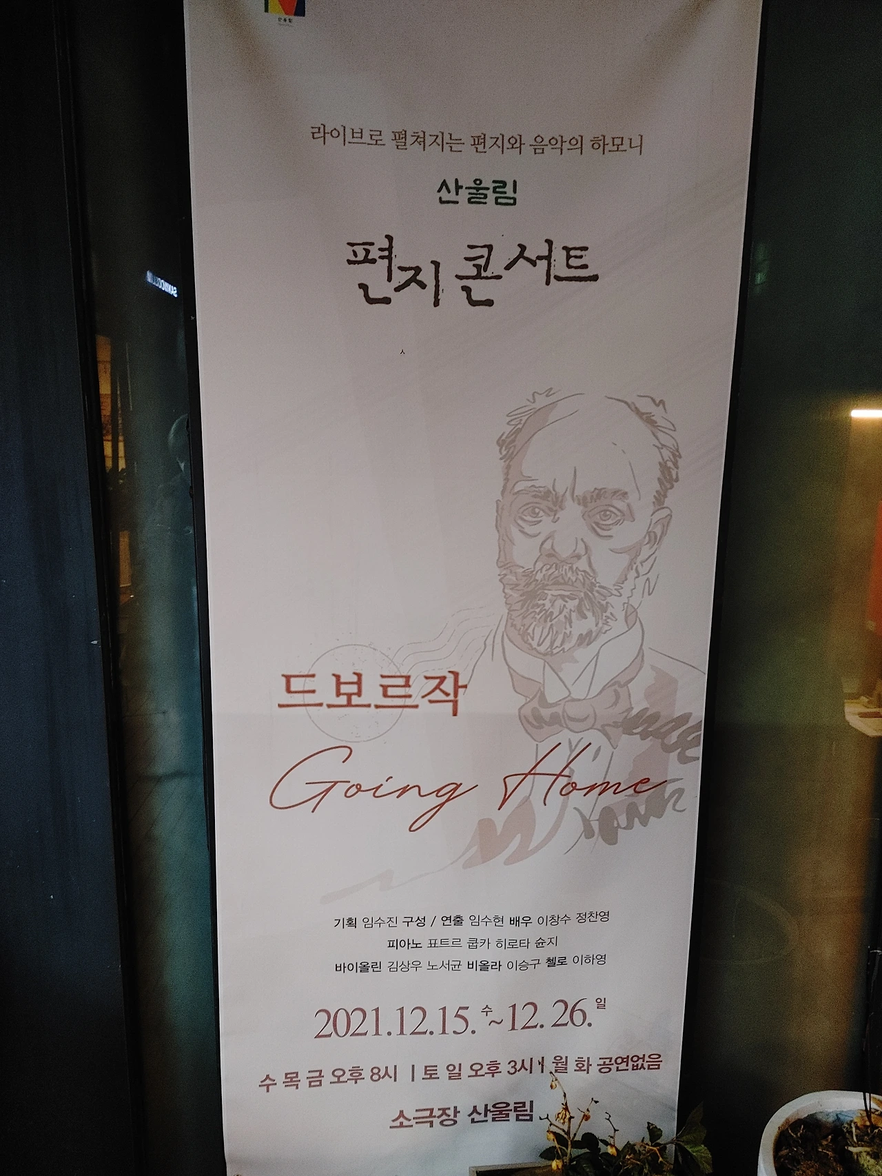 산울림 편지 콘서트 올해의 주인공은 안토닌 드보르작 (1841~1904)이다. 한 기자의 인터뷰를 시작으로 드보르작의 삶과 생각들을 알아가면서 중간 중간에 그의 낯익은 음악을 라이브 연주로 듣는 형식인데, 클래식이 익숙치 않을 수 있는 관객을 위해 연극이 친절한 가이드 역할을 톡톡히 해낸다. 민족, 언어, 국가로 복잡하게 얽혀진 동유럽의 당대 현실에서 자신의 음악에 체코 민족의 정체성을 끝까지 지키고자 했던 음악가의 진정성이 크게 와 닿았다. 모처럼 듣는 소극장 라이브 연주도 아주 좋았는데, 현악4중주 '아메리카' 1악장과, 두 명의 연주자가 연주하는 한대의 피아노 곡으로 편곡한 교향곡 9번 4악장 연주가 내게는 가장 인상적이었다. 거대한 콘서트홀이 아니어도 생활속의 작은 공간에서 이런 소규모의 친절한 연주회가 늘어나면 좋겠다. 연말을 맞아 공연장 나들이를 계획하시는 분들에게 강추! 12/26일까지 소극장 산울림