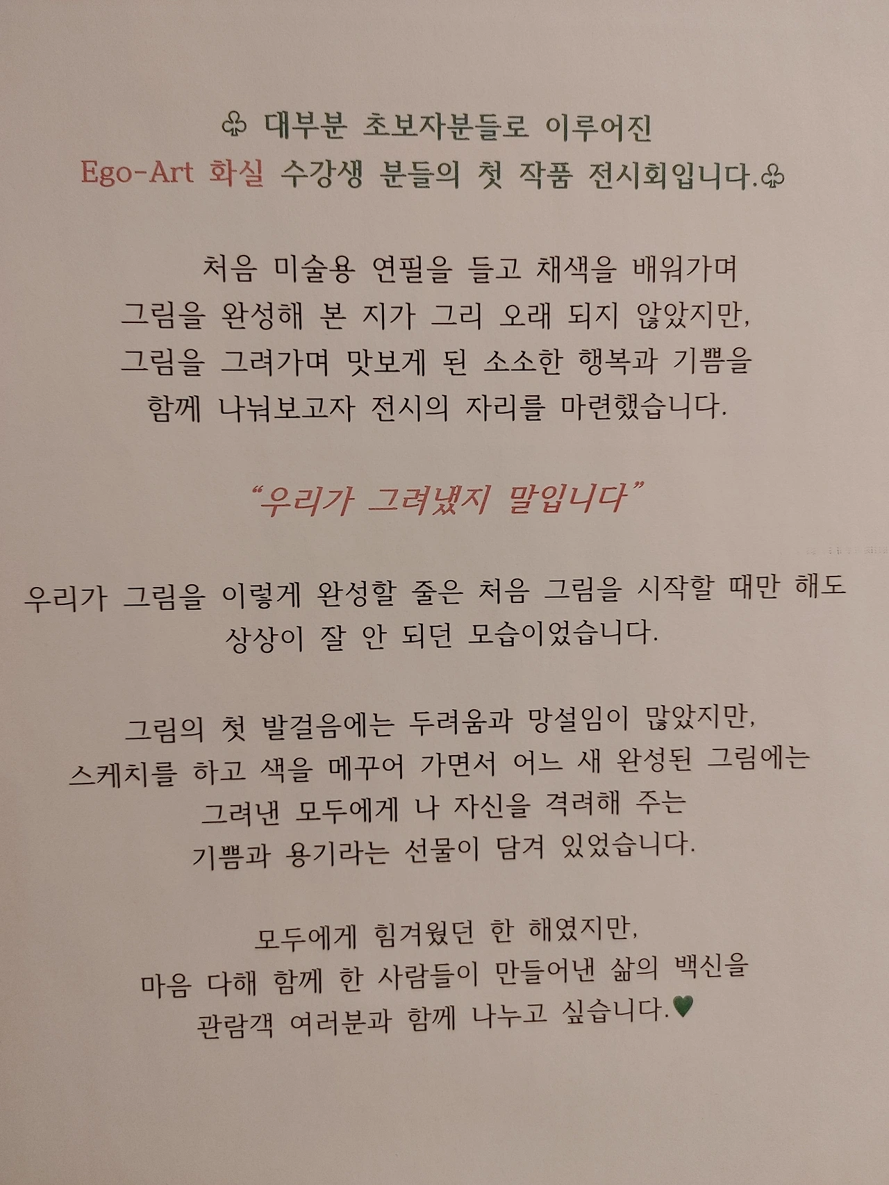 코로나로 인해서 우연한 기회에 취미로 화실에 다닌지 벌써 2년이 다 되어간다. 그간 집중해서 그림 그리는 일이 가져다줄 수 있는 정신의 평온과 성취감 등에 대해 주변에 자주 떠들고 다녔었는데, 친구 중 하나가 작년 이맘 때 같은 취미를 시작했다. 예전부터 자신이 여행했던 인상깊은 여행지들을 그려서 최근에 2022년 탁상달력을 만들어 주위에 선물하는가 싶더니, 이번에는 같은 화실 사람들과 작은 전시회를 연다고 해서 훌쩍 다녀왔다. 아직 습작의 티가 나는 그림부터, 제법 프로의 냄새가 나는 그림, 강사 선생님의 찬조 작품에 이르기까지 다양한 소재로 그린 여러 장르의 그림이 걸려있었다. 완성도에 상관없이 짧지 않은 기간 동안 기울였을 아마추어 화가들의 시간과 노력의 공력을 여실히 느낄 수 있었다. (가끔 팔리는 그림도 있다지만) 돈이 되지 않는 무언가를 위해 자신의 모든 정신을 모아 그림을 완성해간다는 점에서 모든 작품들은 그야말로 '순수 미술'이 아닐까? 전시장이 중랑구 상봉역 근처이니 근처를 지나시는 분들은 슬쩍 들러 보시길... 전시는 내일까지!