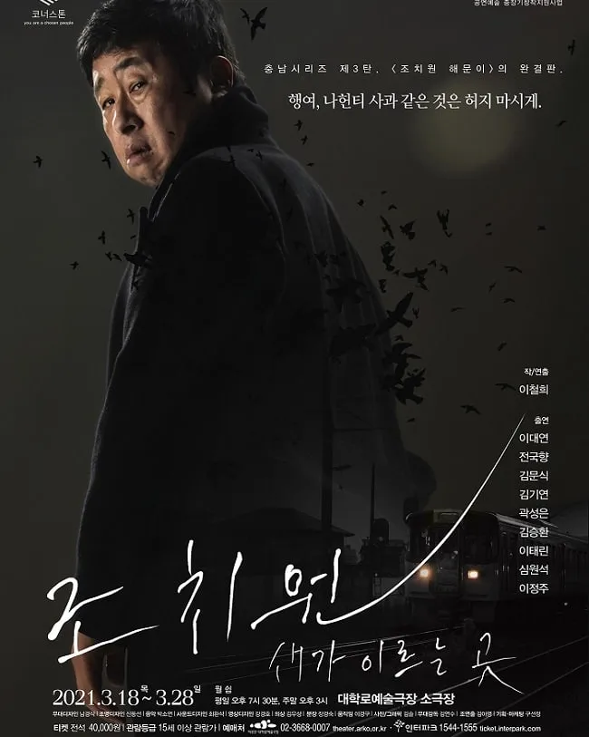 덜컹거리는 심야열차 안에서 한 시인과 장년의 민국이 만나면서 연극이 시작된다. 어두침침한 열차 안, 기차바퀴 소리를 따라 '경부고속도로 개통' 이후 40년에 걸친 한 남자의 이야기가 서울, 조치원, 대전을 오가며 펼쳐진다. 그 이야기에는 유산을 둘러싼 형제간의 갈등, 군대, 여자의 배신, 고단한 객지생활 등이 포함된다. 욕망으로 질척한 삶의 한 순간이 충청도 사투리로 너무나 리얼하게 펼쳐지는가 싶다가도, 간간이 삽입되는 기형도의 시 '조치원'과 더불어 연극의 몇 장면은 시적으로 빼어나게 아름답다. 형의 부음을 받고 조치원에 도착한 민국씨의 선택이 부디 파국보다는 더 많은 이들과 화해하고 그들을 살리는 것이기를... 민국씨가 조치원에 도달하는 시점은 이 지역이 세종시 개발이라는 이유로 들끓기 시작했던 의미심장한 시절이다. 그 다음 이야기는 '조치원 해문이'로 이어진다고...