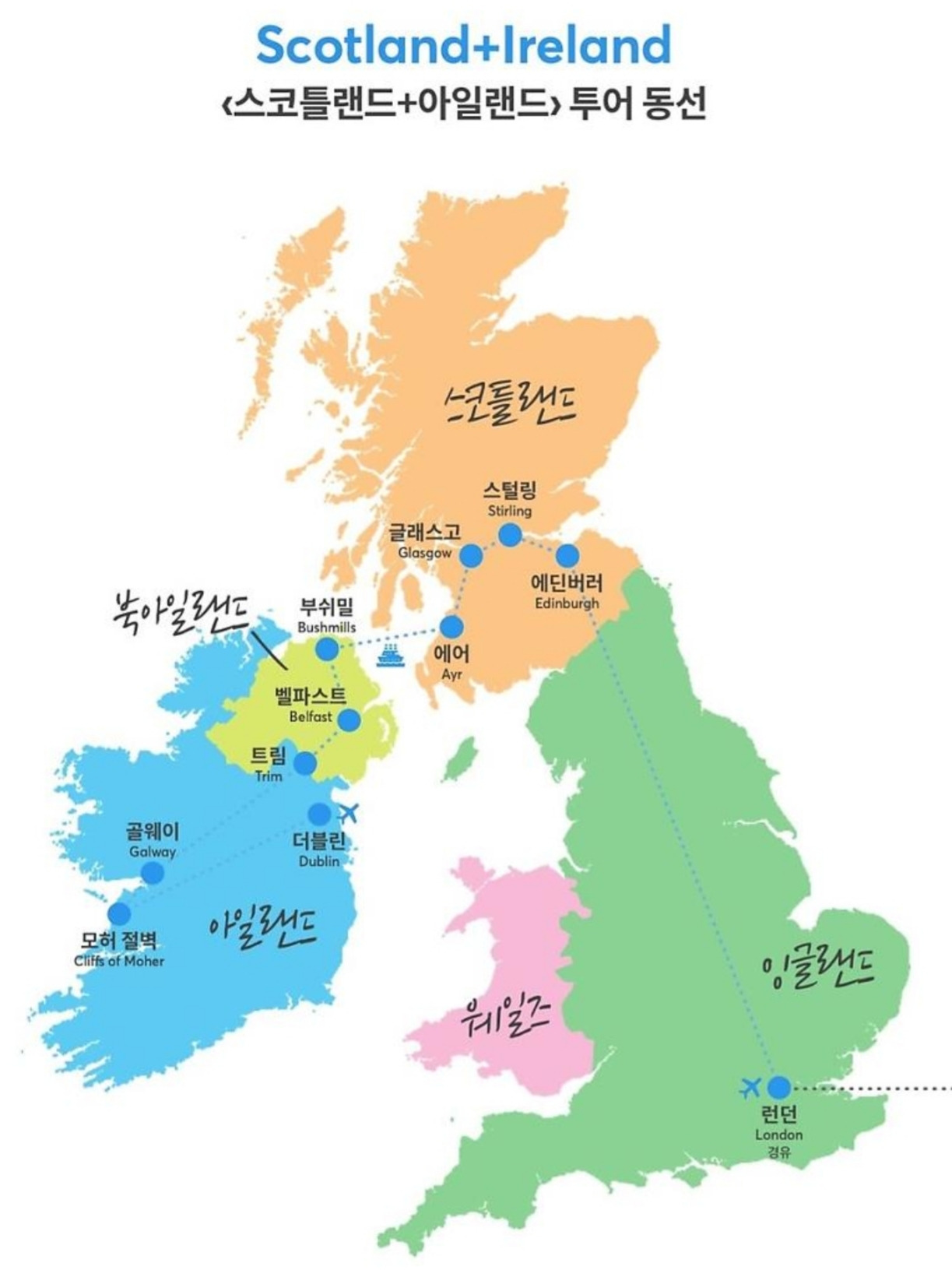 1월 중순에 초등학교를 졸업하는 딸아이와 함께 스코틀랜드와 아일랜드를 여행했다. 영국을 가 본 적은 있지만 스코틀랜드는 짧은 에딘버러 방문이 다 였고, 아일랜드를 못가서 오랫동안 아쉬웠던 차에 마침 두 곳을 묶은 여행상품을 발견하고 망설임 없이 몇 달 전에 예약을 해 둔 터였다. 영국을 처음 가 보는 딸 아이가 둘러보기엔 일정이 어떨까 싶었지만, 뭐 어떠랴? 여행에 무슨 순서가 정해져 있는 것도 아니고 아이는 아이 방식대로 이 여행을 즐기고 기억하리라. 여행의 전체 일정은 다음과 같았다.