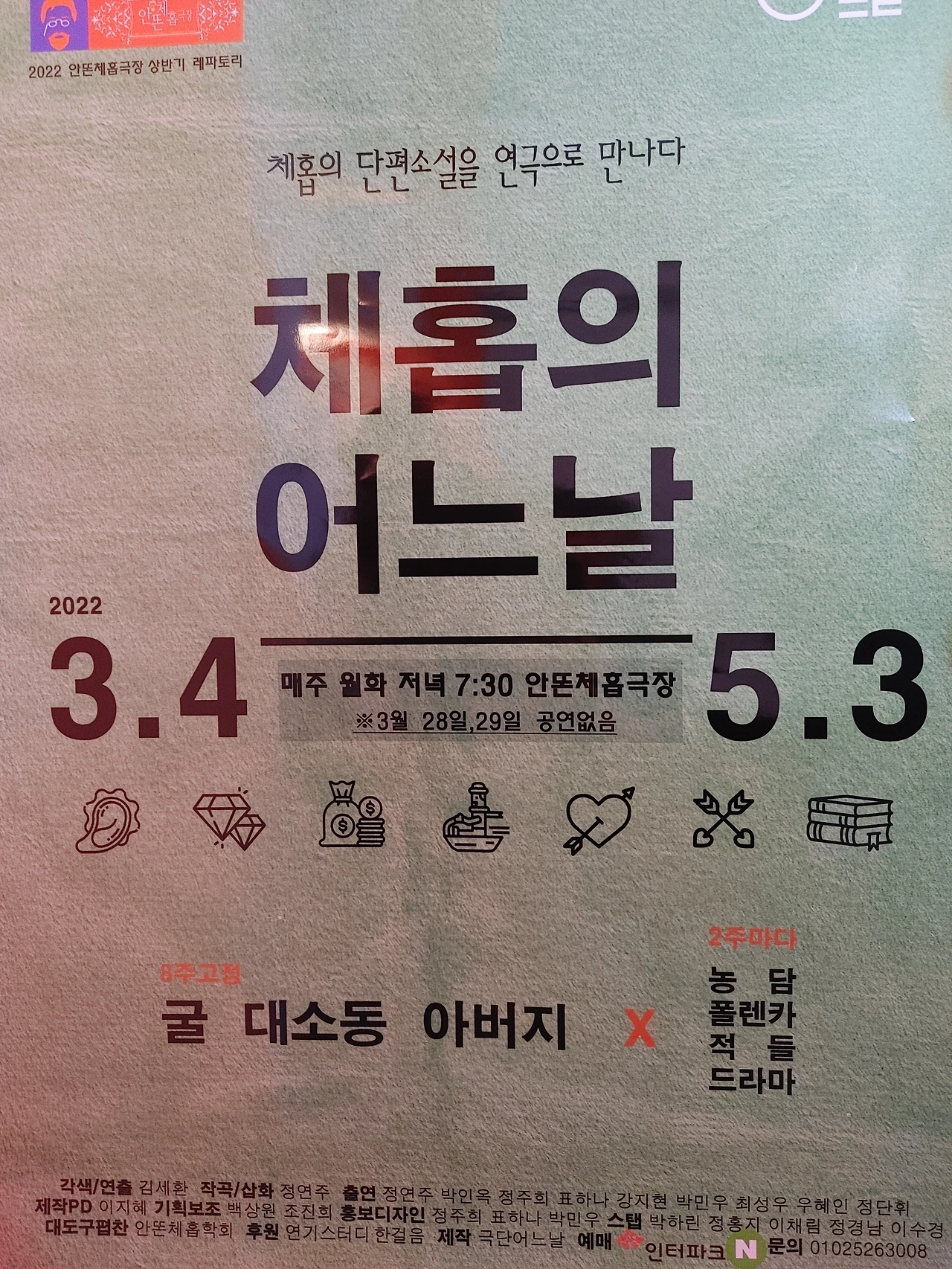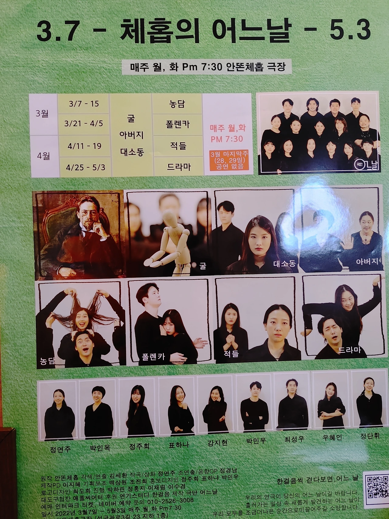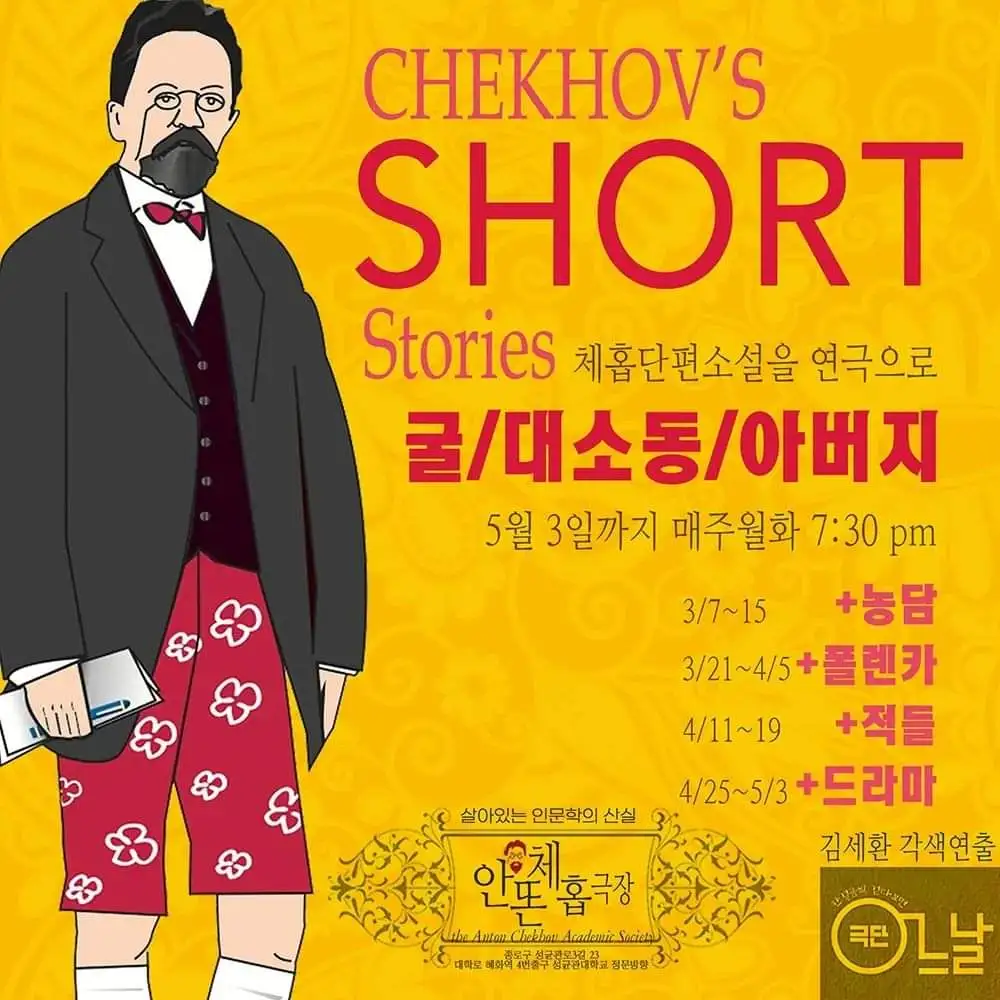 극단 어느날의 체홉단편 시리즈가 세 편의 신작과 한 편의 재공연작으로 돌아왔다. 이전 시리즈 처럼 두 편의 비극과 두 편의 희극. 연극은 인간 삶의 아이러니, 슬픔, 광기, 비애의 순간을 기막히게 포착하여 무대에 펼쳐놓는데, 19세기 제정러시아 사회라는 배경이 무색할 정도로 상황과 인물들은 현대적이서 오늘의 관객들도 충분히 공감할 수 있다. 가장 기본적인 무대장치와 배우들의 감정선을 따라가는 심플한 피아노 선율, 배우들... 연출은 모든 장식과 과장을 배제하고 연극의 본질만으로 승부하기로 작정한 듯. 크든 작든 배역에 깊이 몰입하여 작은 호흡 하나 놓치지 않는 배우들의 연기는 희비극을 오가는 네 편의 단편을 이끌어가는 큰 힘이다. 5/3일까지 월화공연 안톤체홉극장 #극단어느날 #체홉의어느날
