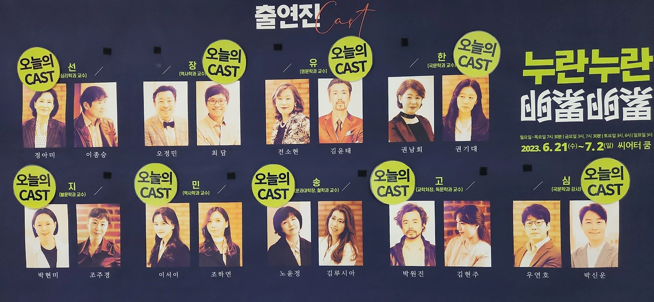 연극이 시대를 초월한 명작이나 고전을 무대에서 보여줄 수도 있지만, 당대의 당면한 사회적 문제를 소재로 다룸으로써 동시대인들에게 문제 제기를 할 수도 있다. 이 작품은 후자의 경우인데 지난 몇 년간 심화돼 가고 있는 지방대학, 특히 인문학과의 위기를 다루고 있다. 대학 예술학부의 지극히 사실적인 모습과 위기의 징후들은 최근 재연된 제12 언어스튜디오의 ‘대학과 연극’에서도 다루어진 바 있는데, 그 고민의 연장선에 있다고 할 것이다. 이 연극은 대학의 신입생이 줄면서 문과대학을 글로벌 문화학부로 통폐합하려는 한 지방대학에서 벌어지는 대학당국과 인문학 전공 교수들간의 갈등과, 상황에 따라 이합집산하는 인물군상들의 모습을 코믹하지만 너무나도 리얼하게 그리고 있다. 도대체 이런 소재의 결말을 어떻게 맺을까 궁금했는데, 연극은 현재의 엄중하고도 웃픈 현실을 꼼꼼히 보여주고나서 다소 코믹하거나 부조리하게 마무리 된다. 거대한 시대적 흐름 앞에 연극 한 편이 깔끔한 해결책을 찾거나 결론을 내기가 쉽지 않았을 것이다. 극사실적인 장면의 묘사는 중견배우들의 세심한 연기에 힘입고 있고, 단순한 듯 하지만 효과적인 무대의 활용도 인상적이다. 위기에 처한 대학과 인문학의 현실과 고민에 대해 생각을 나누어 보시길. 제목인 누란누란(累卵累卵)은 ‘층층이 쌓아 놓은 알이란 뜻으로, 몹시 위태로운 형편을 비유적으로 이르는 말’이라는데 단지 한 지방대학의 모습 뿐만 아니라 이 시대에 던지는 거대한 화두같다. 7/2일까지 씨어터쿰