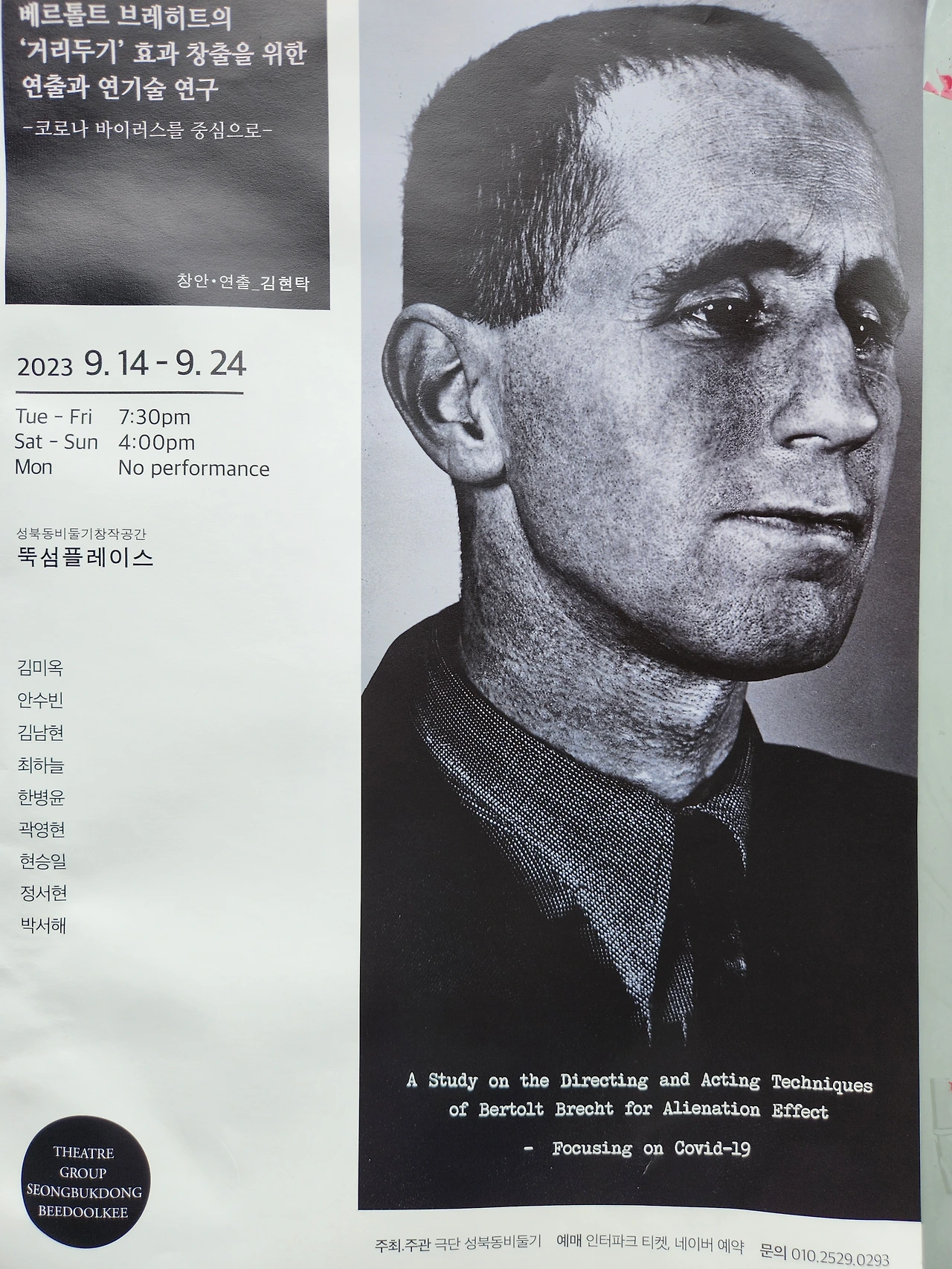 코로나 바이러스를 중심으로... 라는 긴 제목의 연극이 극단 성북동비둘기에 의해 공연되고 있다. 연극이 시작되면 무대의 흑판에 마치 오늘 수업의 차례, 혹은 논문의 목차처럼 서론, 가면의 사용, 경극의 영향, 역사화, 이화효과, 게스투스(사회적 몸짓), 자기소개 기법, 노의 영향, 서사적이란? 노래의 도입, 제사의 벽 사용, 막간극, 결론, 참고문헌이란 글이 단정하게 번호 붙여져 있지만 실제로 연극은 브레히트에 관해 거의 설명하지도 않고 그의 연극 장면을 보여주지도 않는다. 목록에 나와있는 제목을 느슨하게 다양한 상황으로 보여줄 뿐인데, 코로나 시국의 풍경이 묘사되기도하고, 현시국의 예민한 쟁점들, 심지어는 80년대 역사의 한 장면이 소환되기도 한다. 이것은 한국적 서사극 혹은 부조리극의 실험인가? 암튼 배우들은 이 모든 부조리한 장면들을 온몸으로 연기한다. 마치 브레히트가 이 시대에는 이런 연극을 했을거라는 듯이... 뚝섬역 근처 조용한 주택가 한가운데에 자신들의 연극적 방법론을 이렇게 지속적으로 실험하는 민간극단이 활동할 수 있다는 게 놀랍다. 자동차 정비소 2층에 자리잡은 개성넘지는 극장도 한 번은 방문해 볼 만 하다. 극단 이름은 '근대 도시화로부터 살아남은 성북동의 비둘기들처럼 동시대 연극의 상업화와 표준화의 물결에 맞서 연극성을 고취하자'는 뜻이라고 한다.